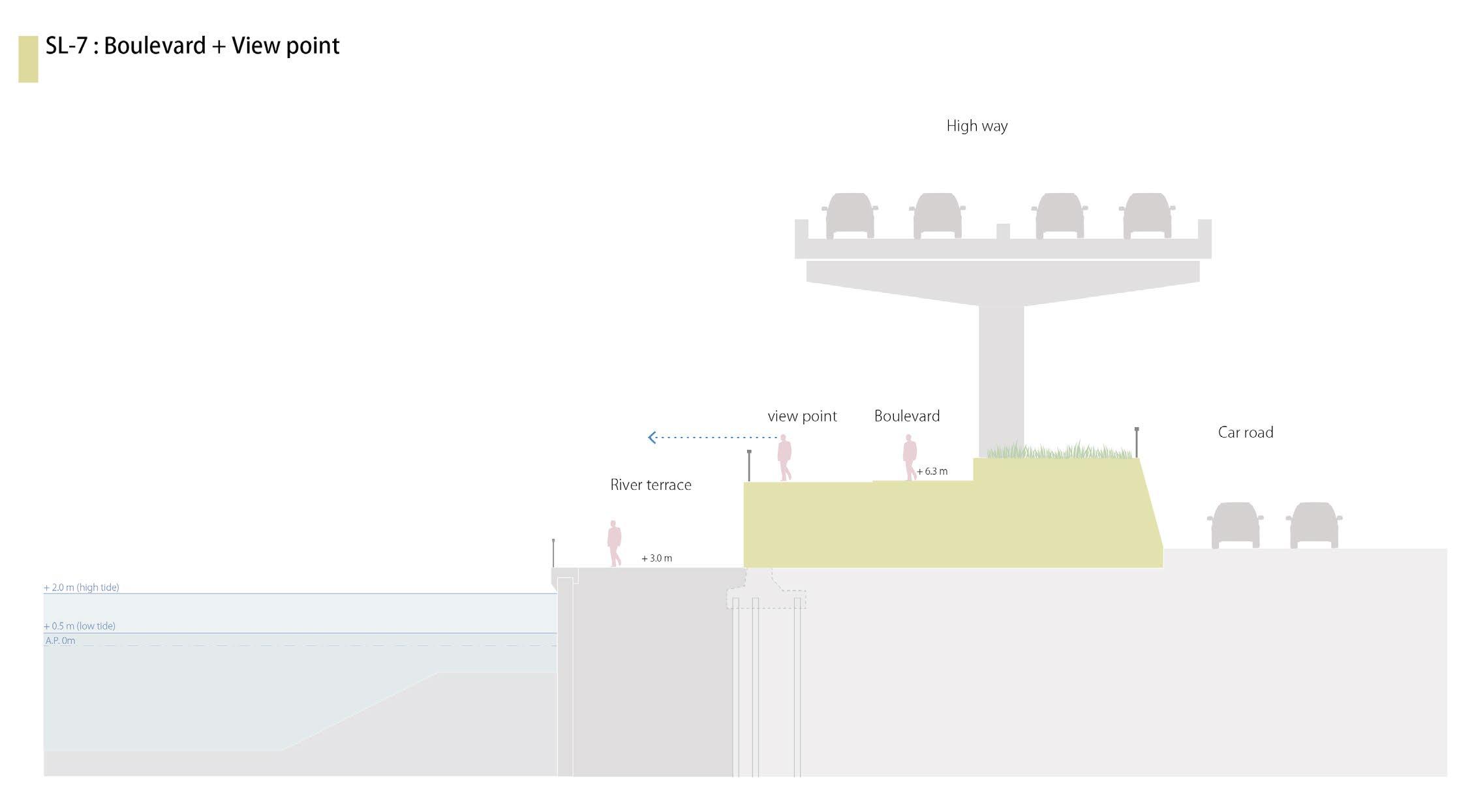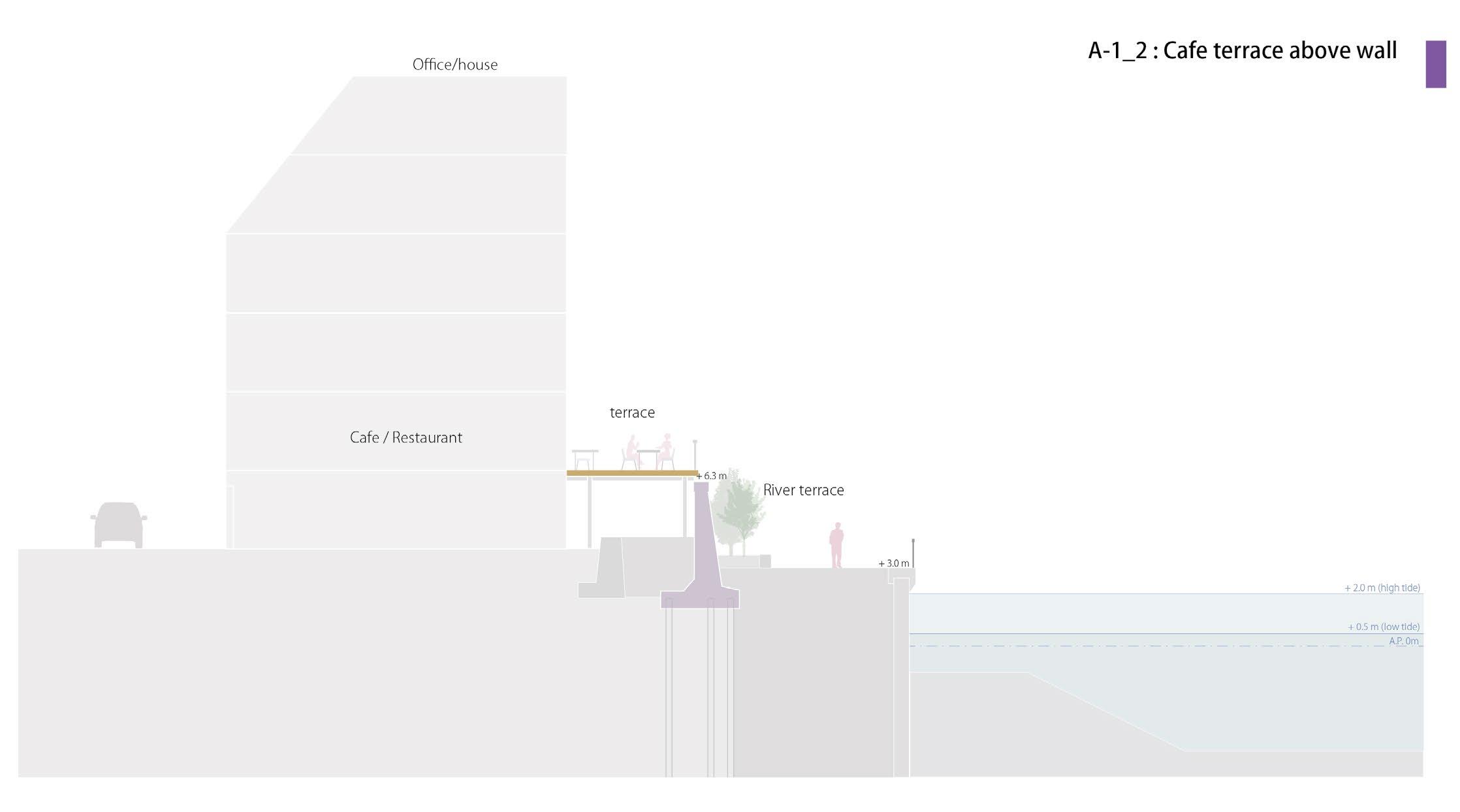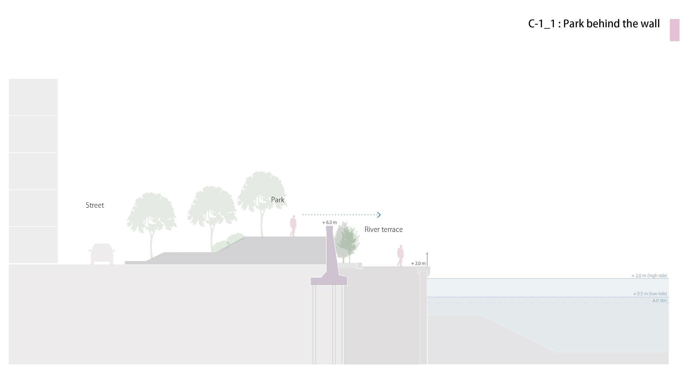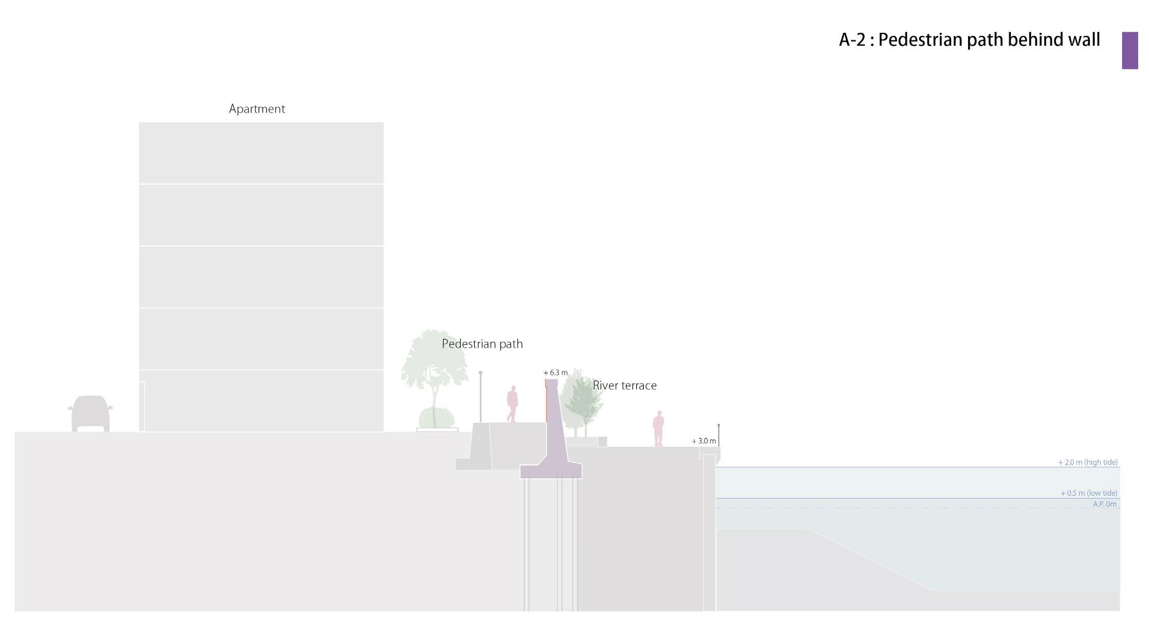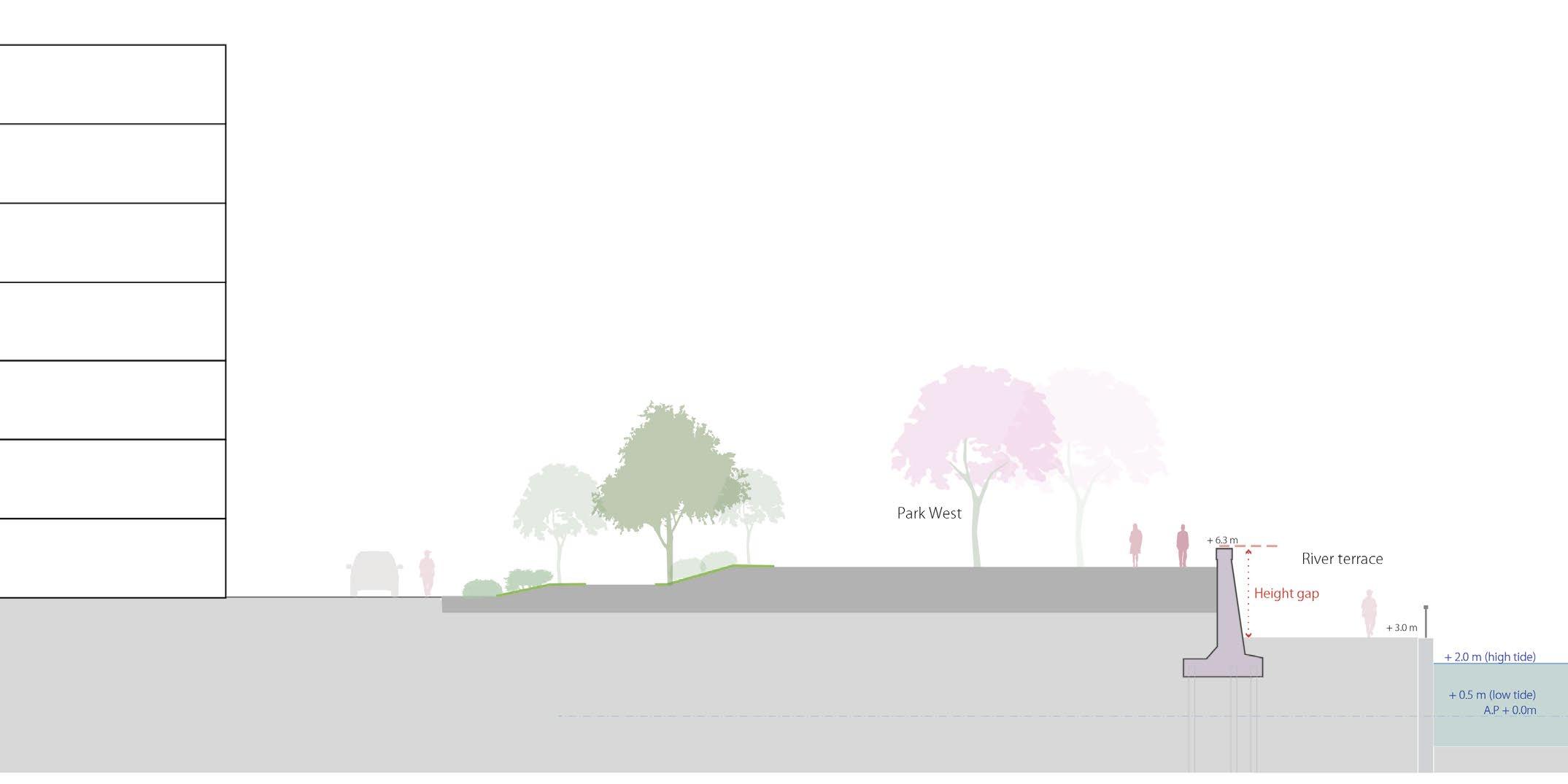 The reinforcement of the floodwall integrates with terraces, providing an elevated structure from which the urban landscape can be viewed. The river space is basically made of hard pavements for the walking area, and on the wall side, a green slope with grass or stairs offering a place to sit or lie down towards the water view. On the riverside, the water steps will be created that appear and disappear by the tidal. Visitors will perceive the natural cycle of the tide by seeing the different sizes of the steps.