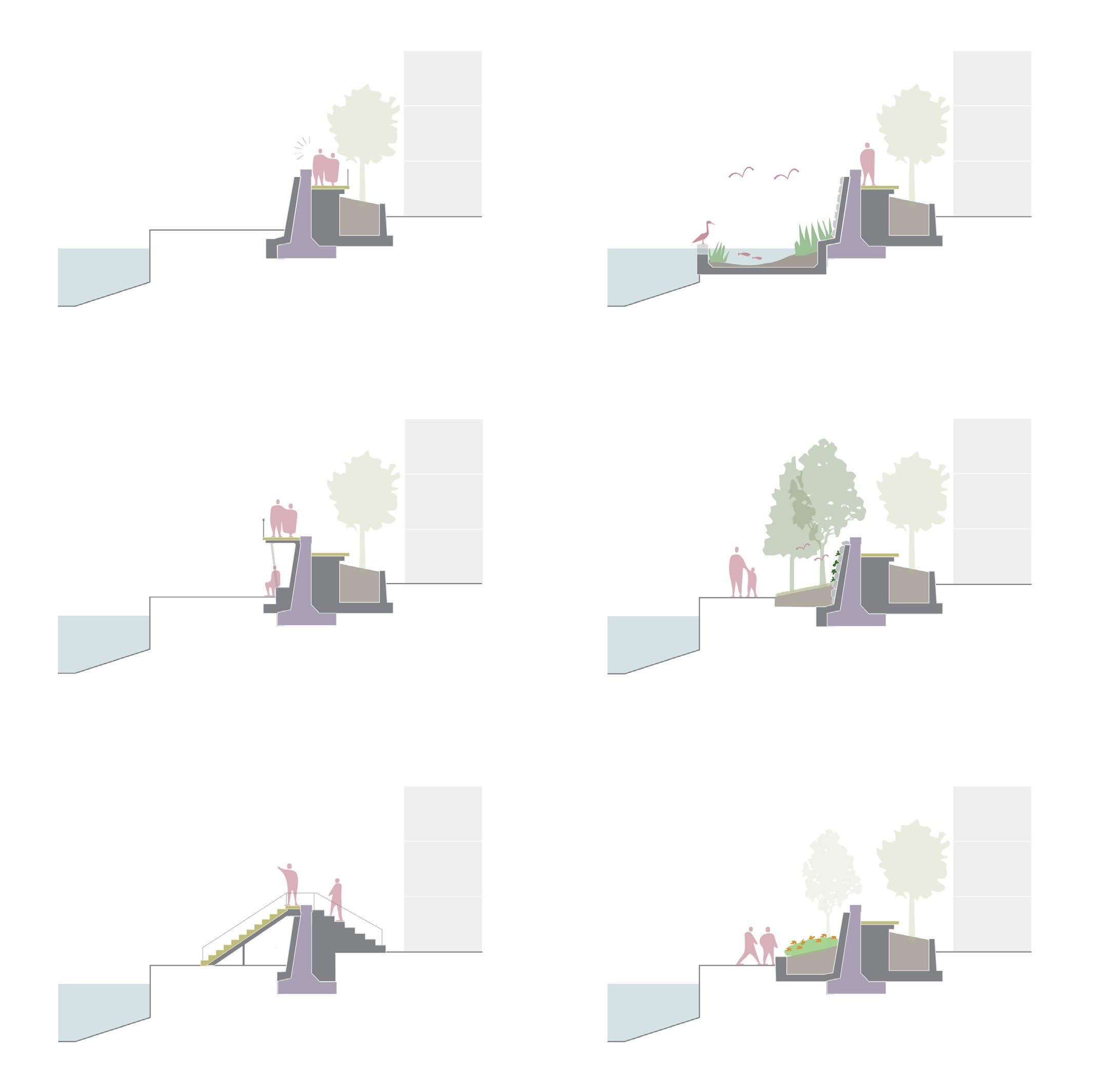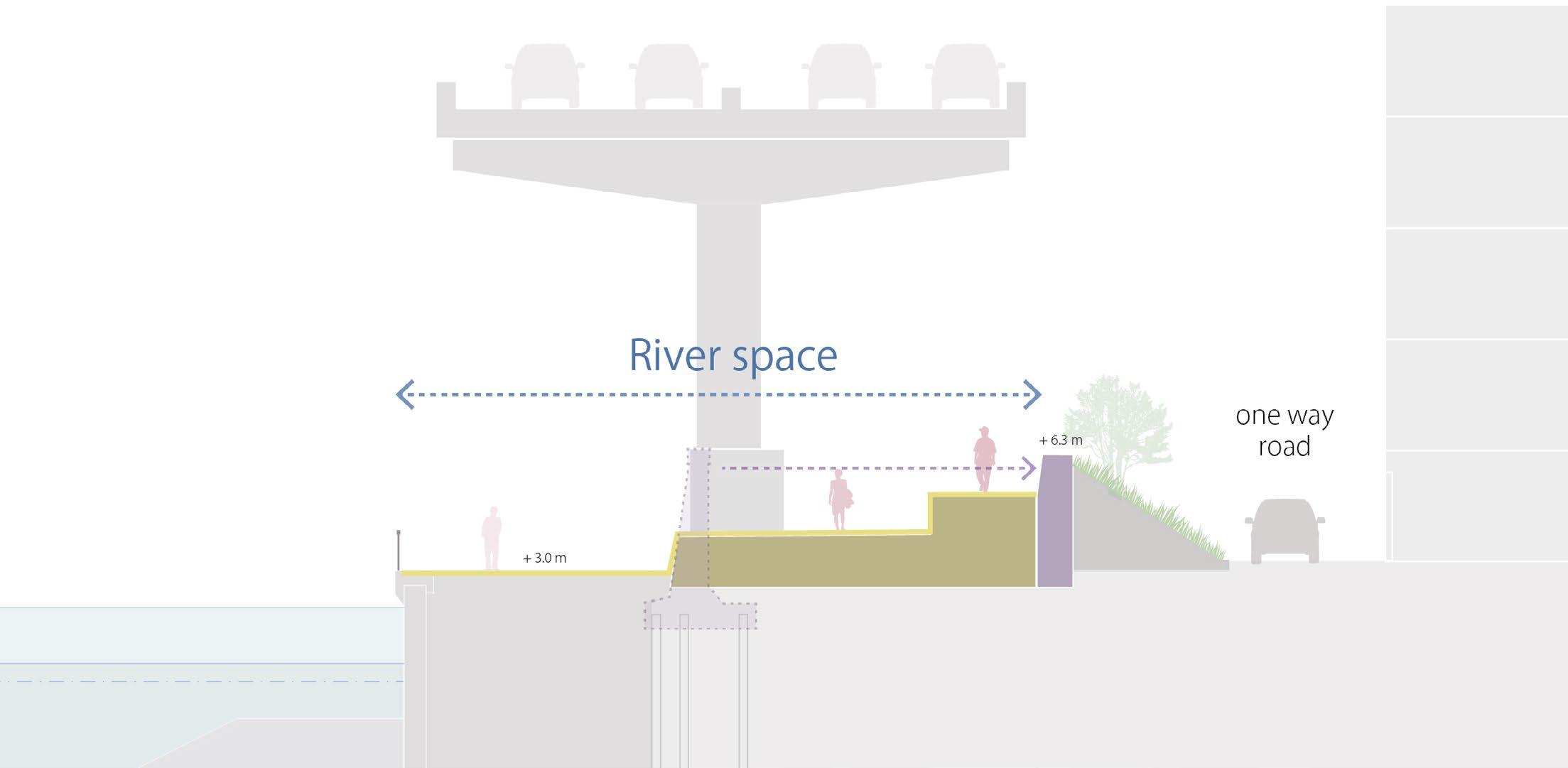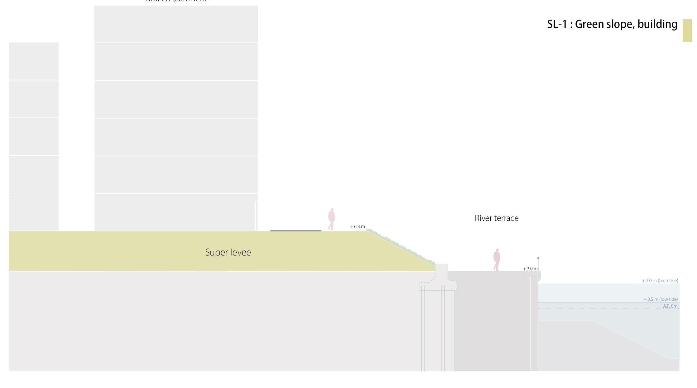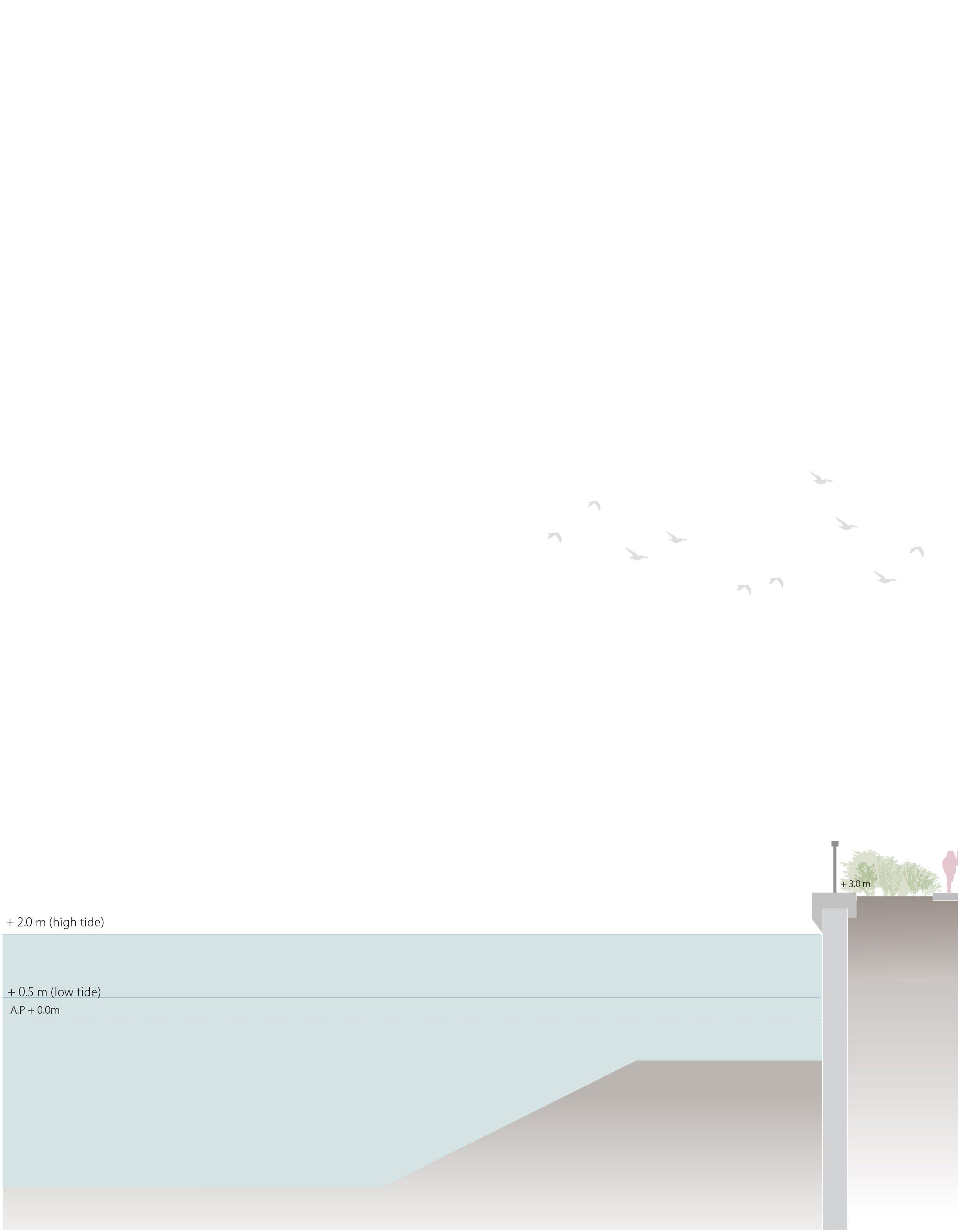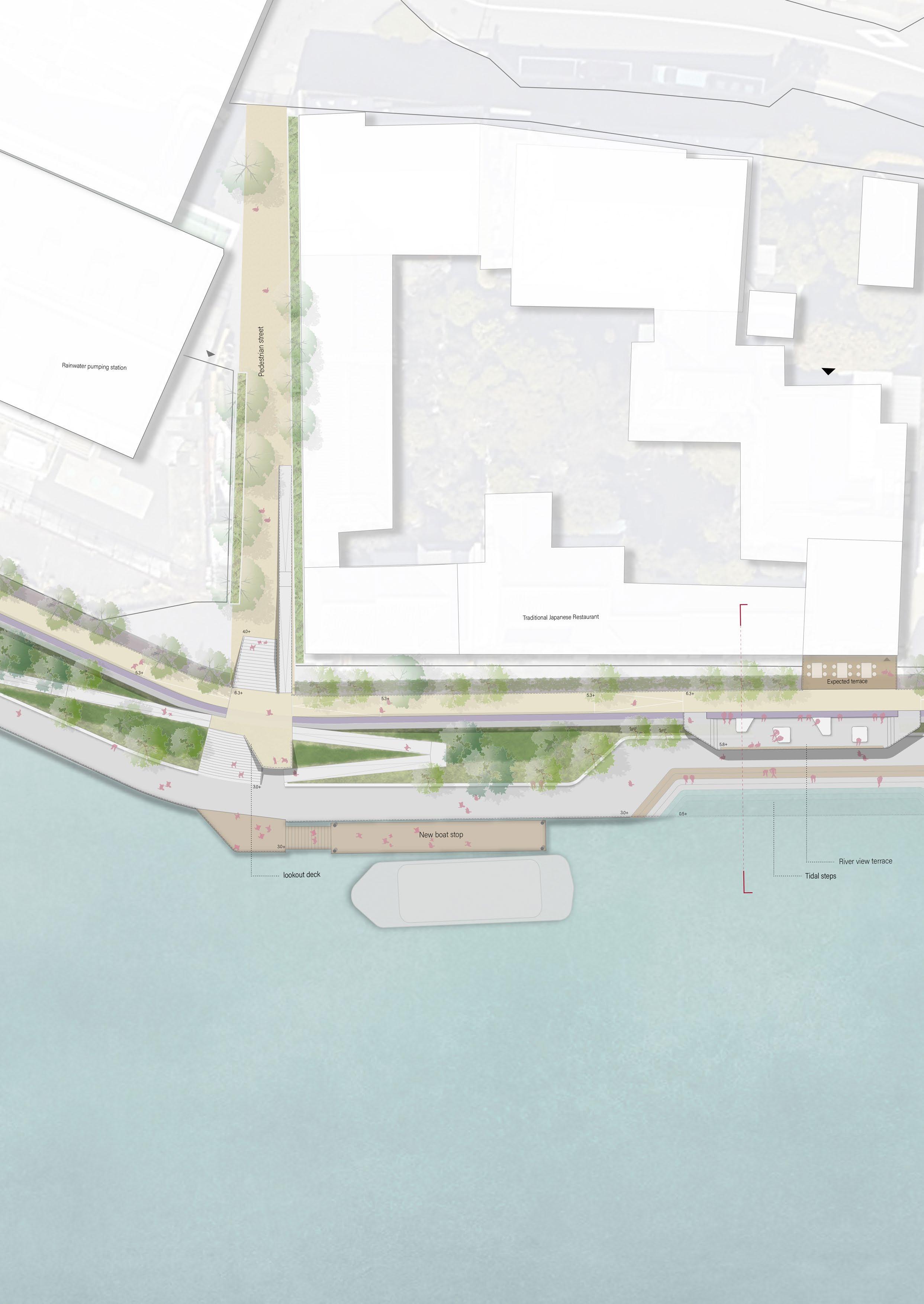 The reinforcement of the floodwall integrates with terraces, providing an elevated structure from which the urban landscape can be viewed. The river space is basically made of hard pavements for the walking area, and on the wall side, a green slope with grass or stairs offering a place to sit or lie down towards the water view. On the riverside, the water steps will be created that appear and disappear by the tidal. Visitors will perceive the natural cycle of the tide by seeing the different sizes of the steps.
