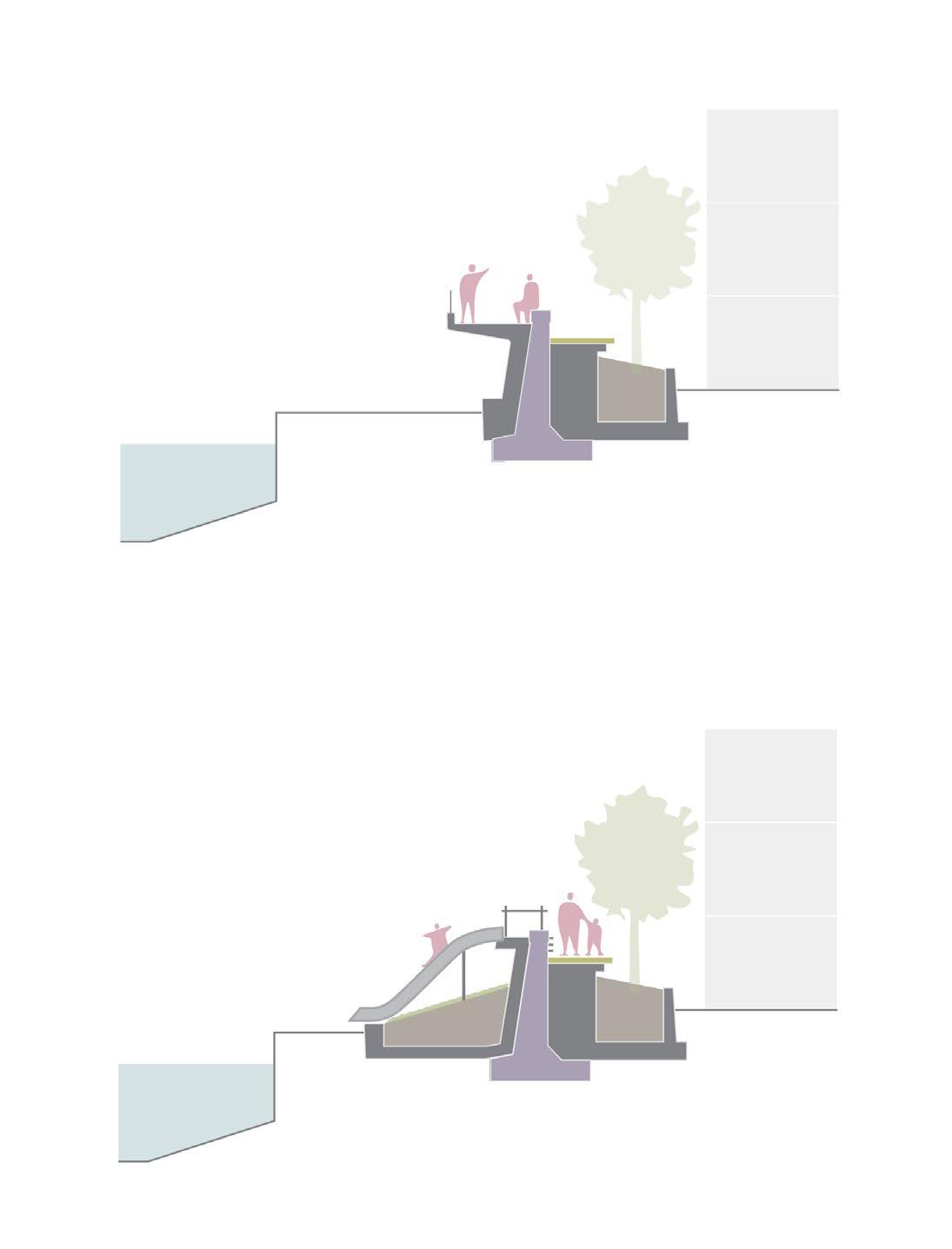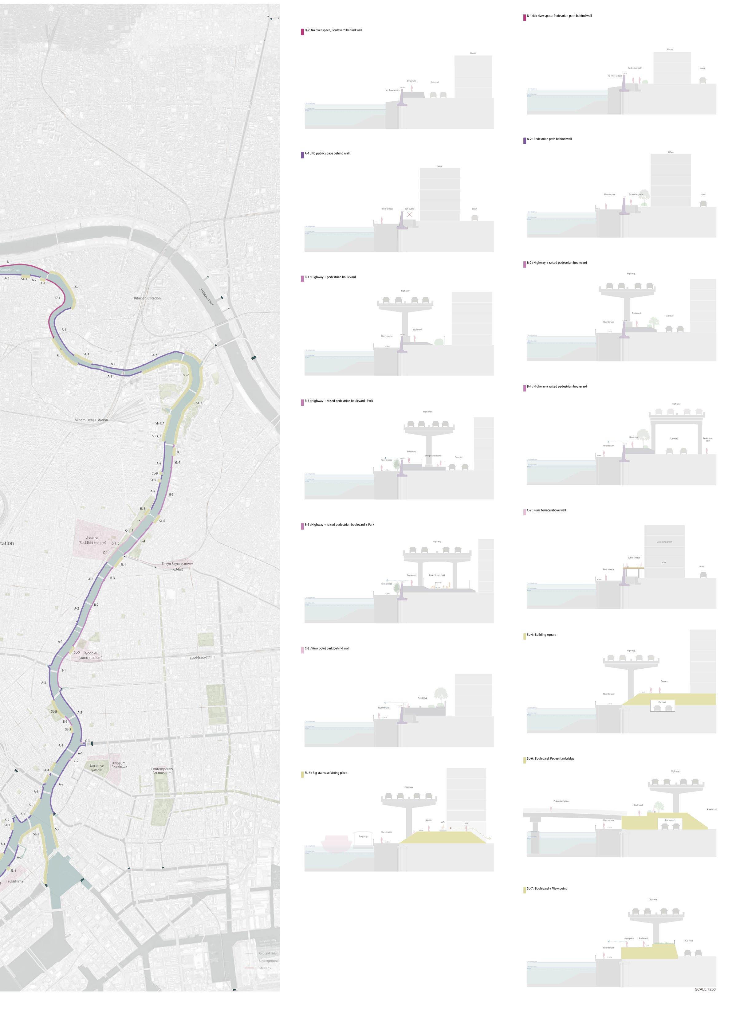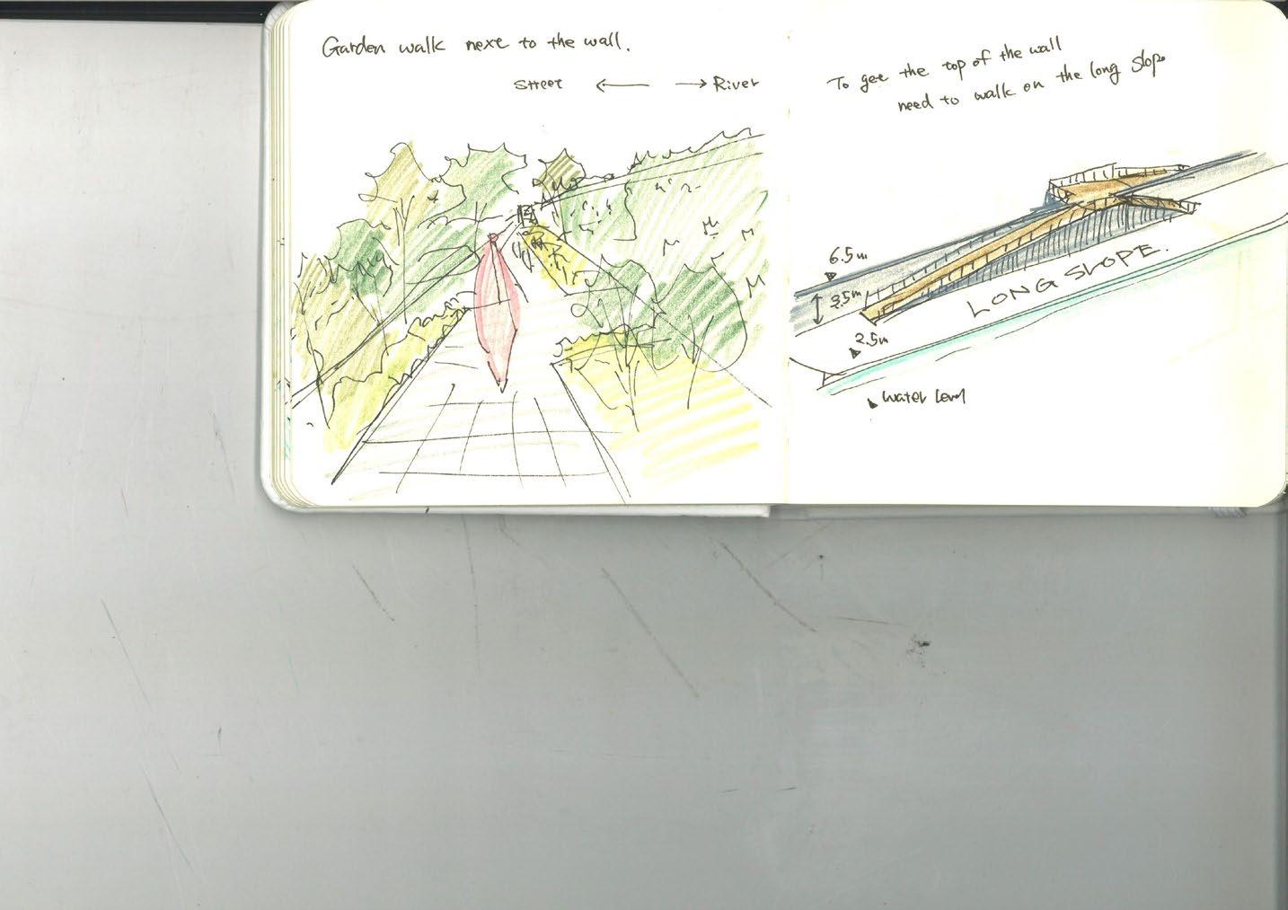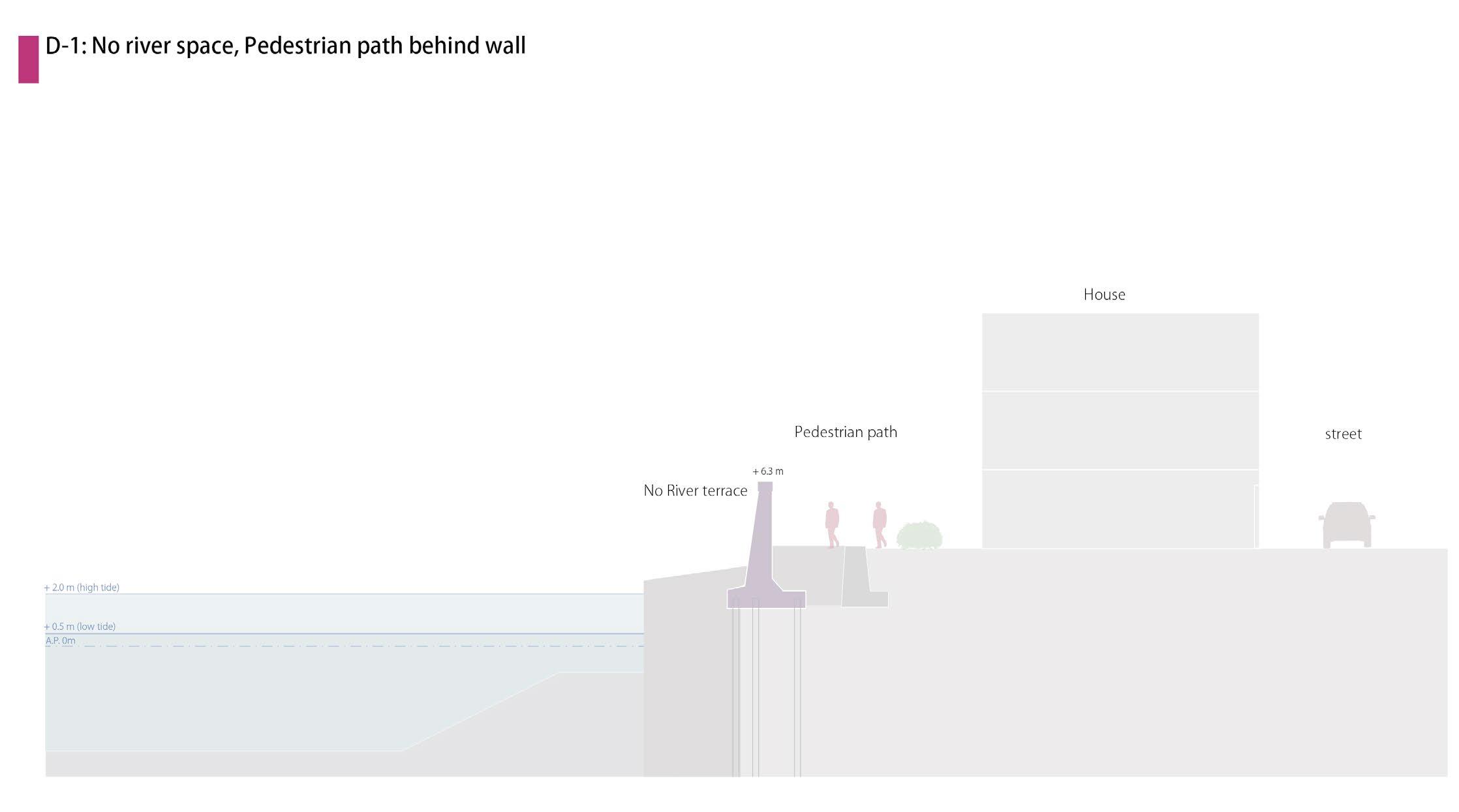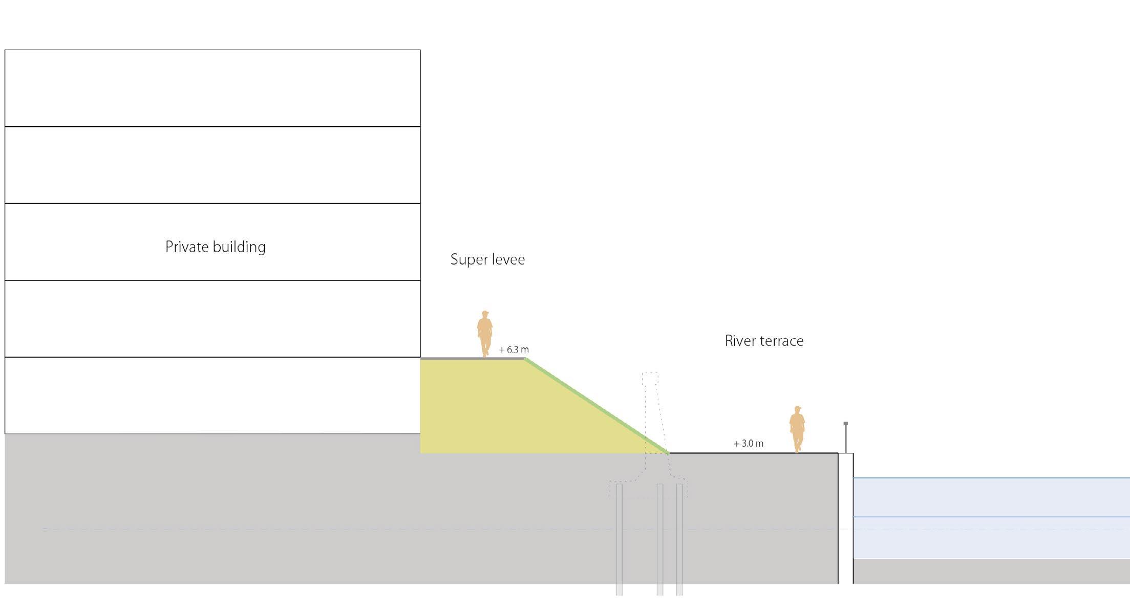The reinforcement of the floodwall integrates with terraces, providing an elevated structure from which the urban landscape can be viewed. The river space is basically made of hard pavements for the walking area, and on the wall side, a green slope with grass or stairs offering a place to sit or lie down towards the water view. On the riverside, the water steps will be created that appear and disappear by the tidal. Visitors will perceive the natural cycle of the tide by seeing the different sizes of the steps.