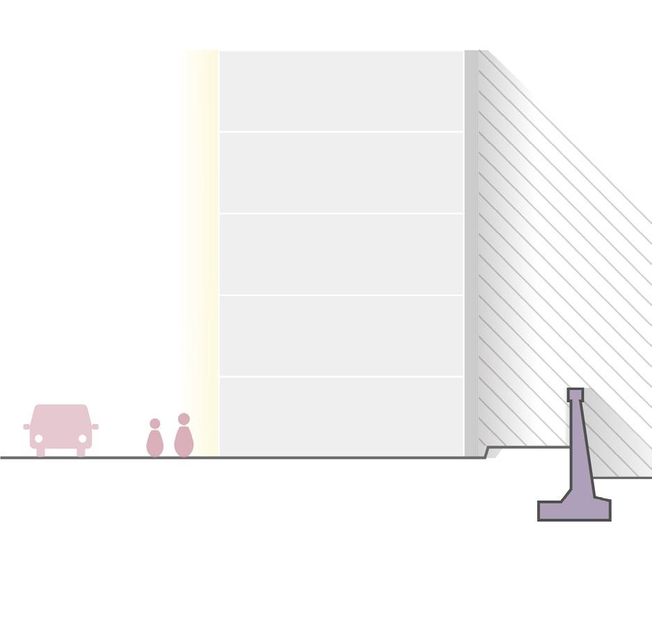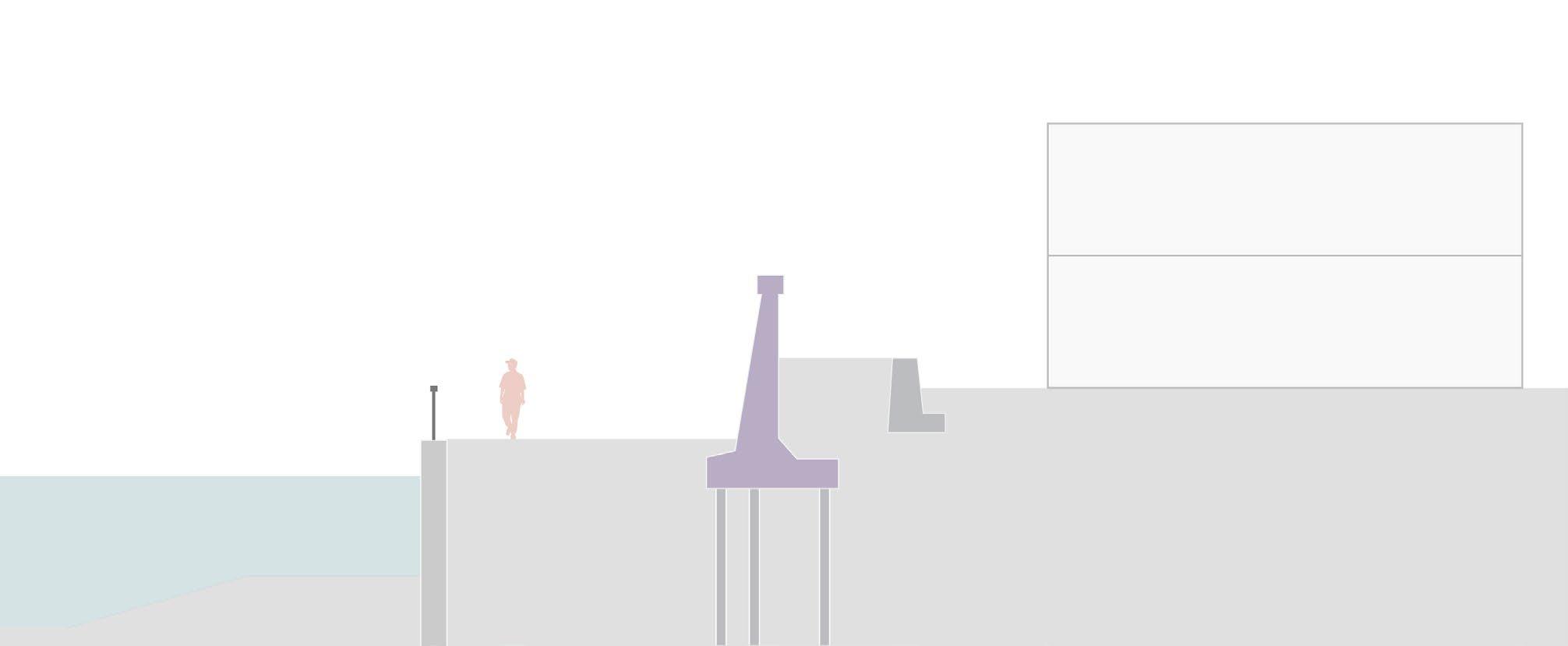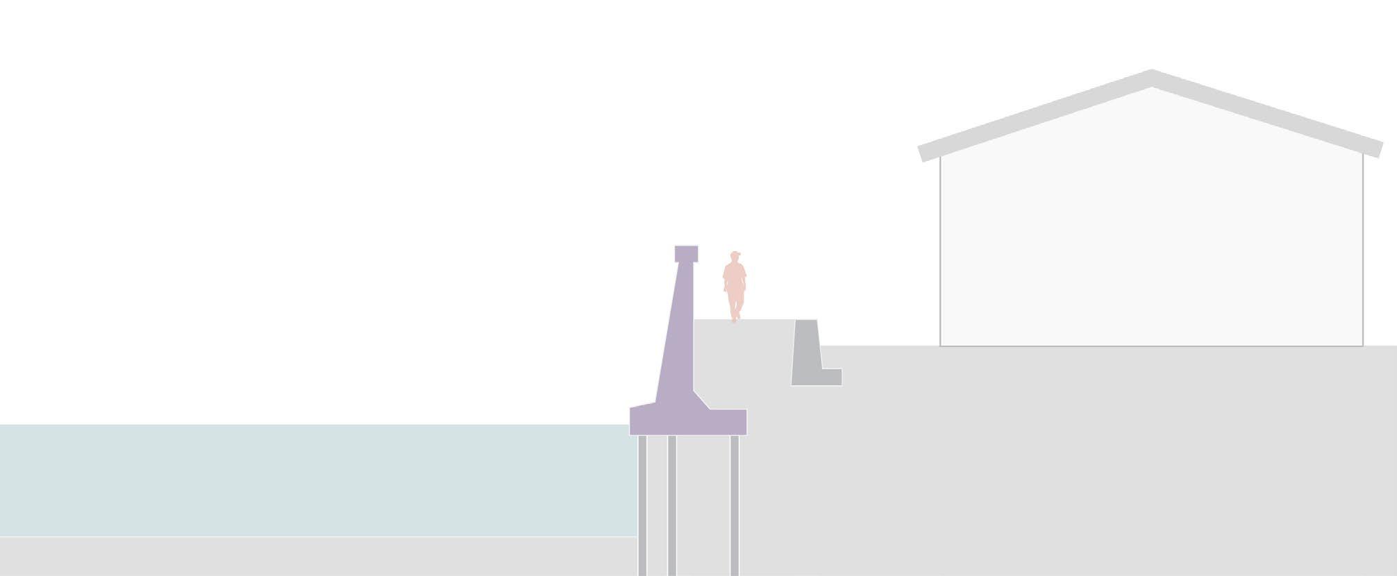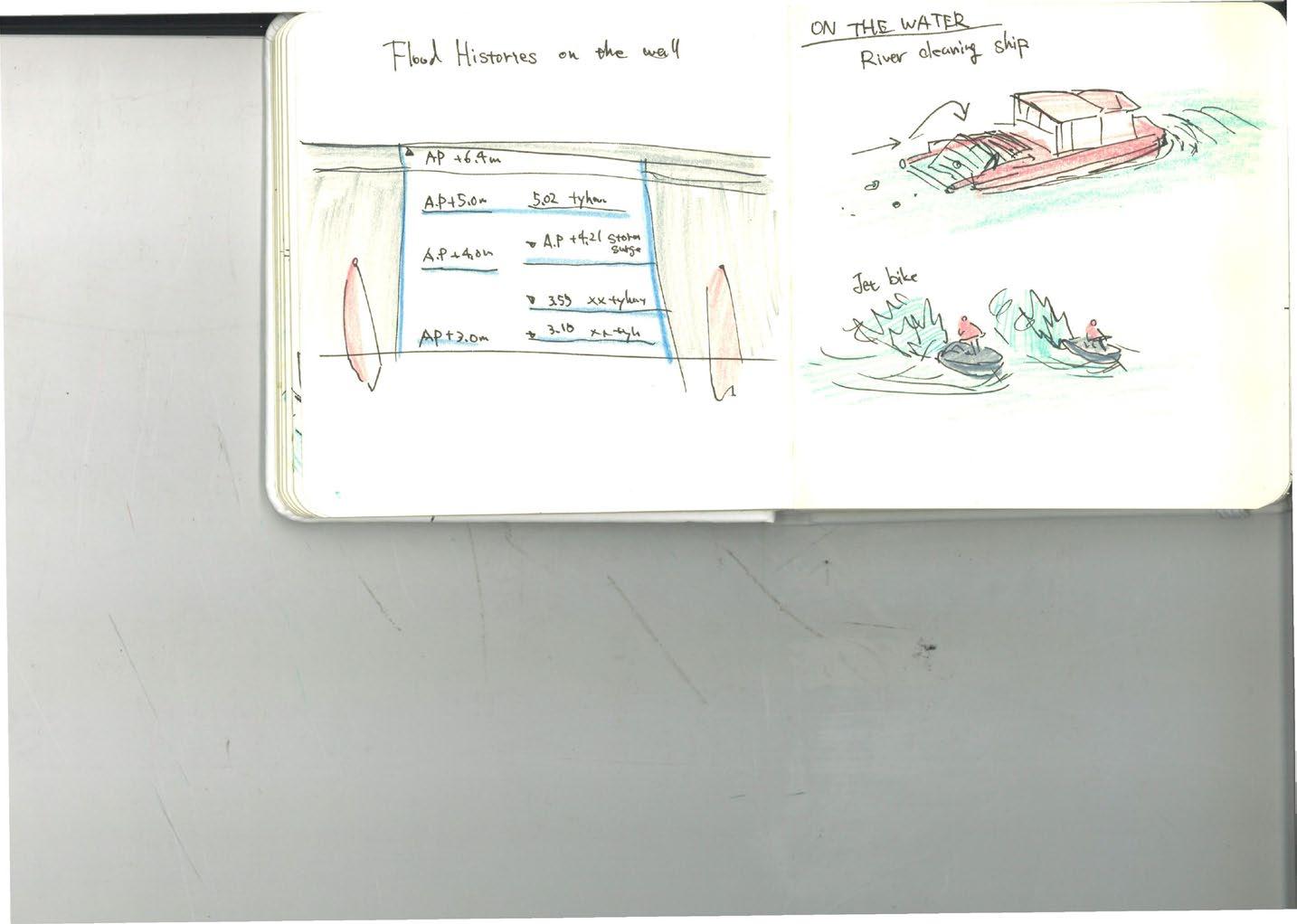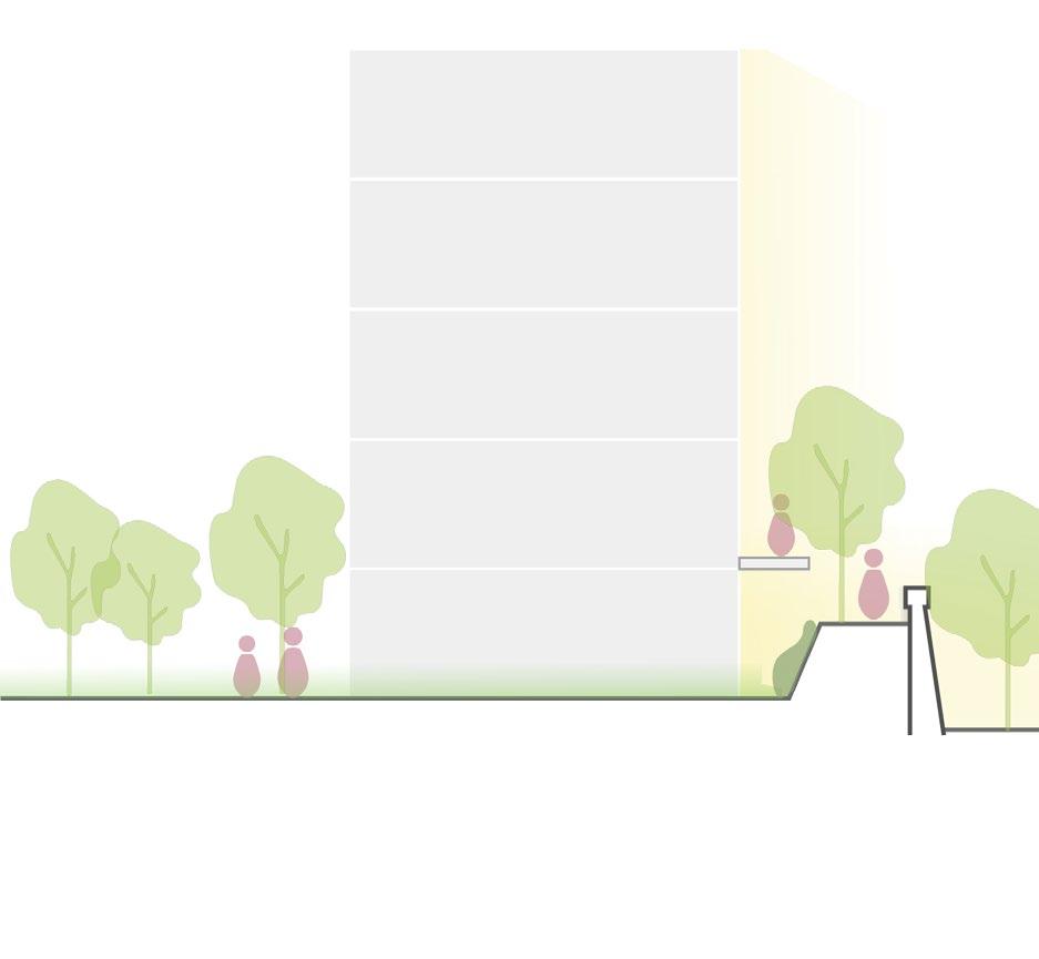 The reinforcement of the floodwall integrates with terraces, providing an elevated structure from which the urban landscape can be viewed. The river space is basically made of hard pavements for the walking area, and on the wall side, a green slope with grass or stairs offering a place to sit or lie down towards the water view. On the riverside, the water steps will be created that appear and disappear by the tidal. Visitors will perceive the natural cycle of the tide by seeing the different sizes of the steps.