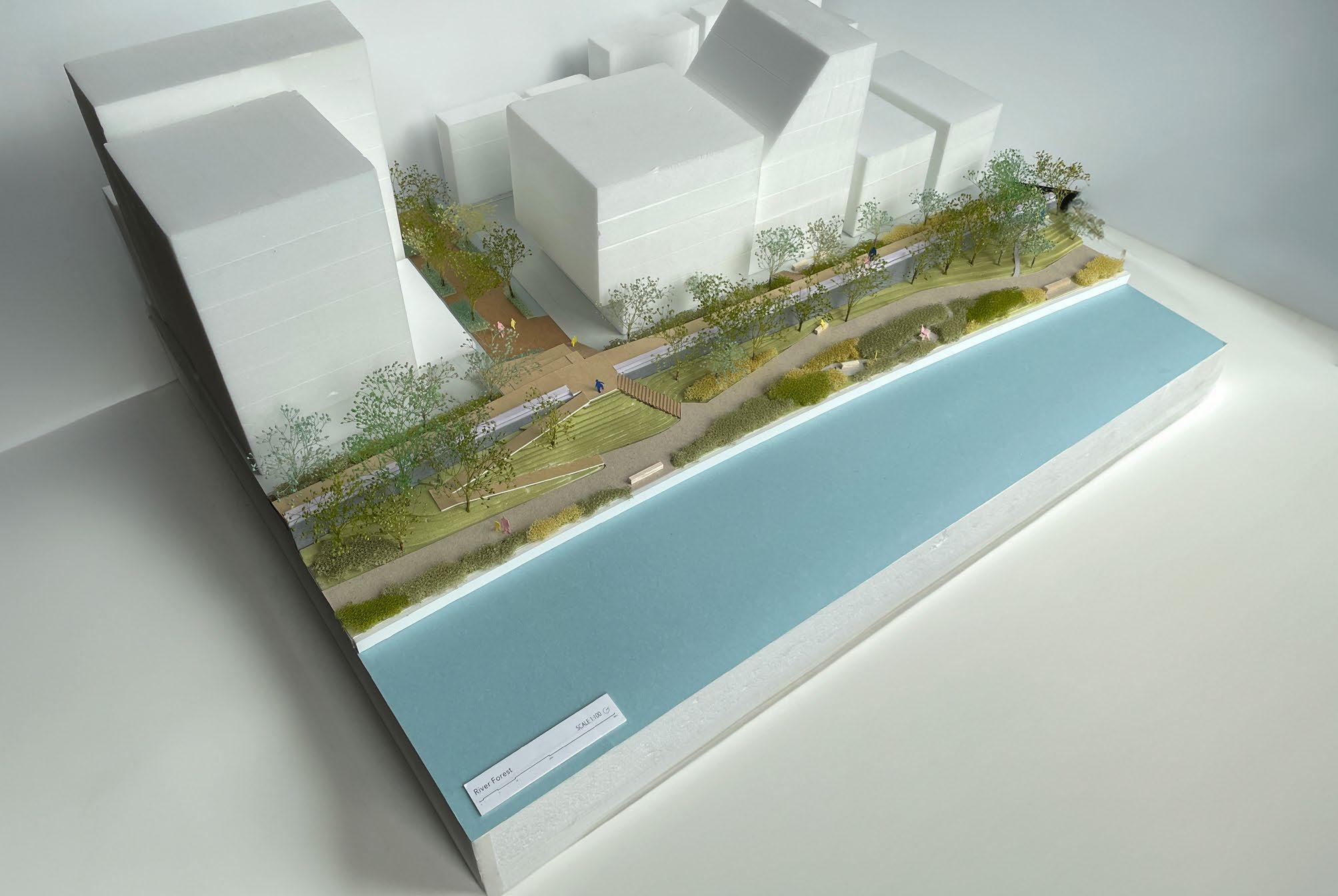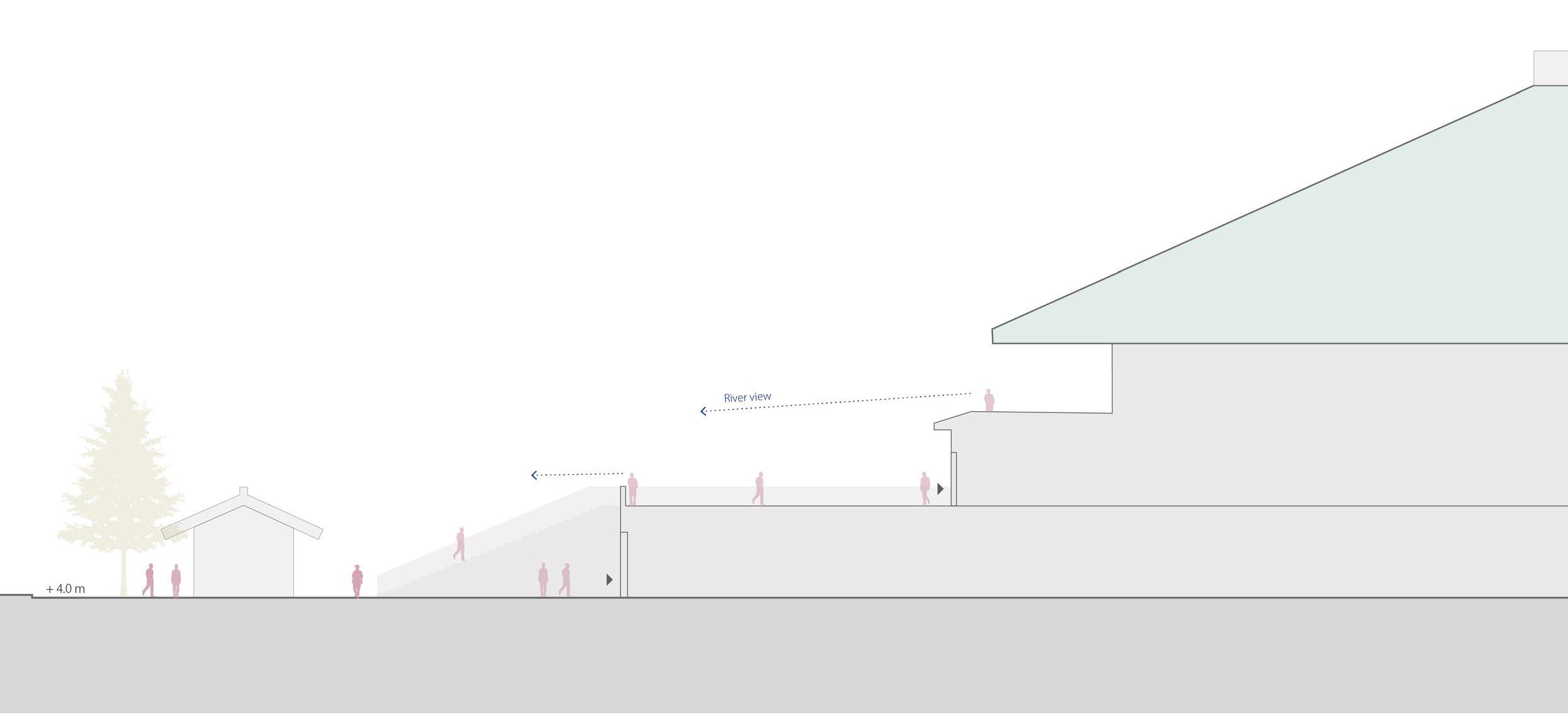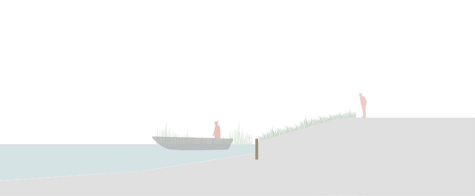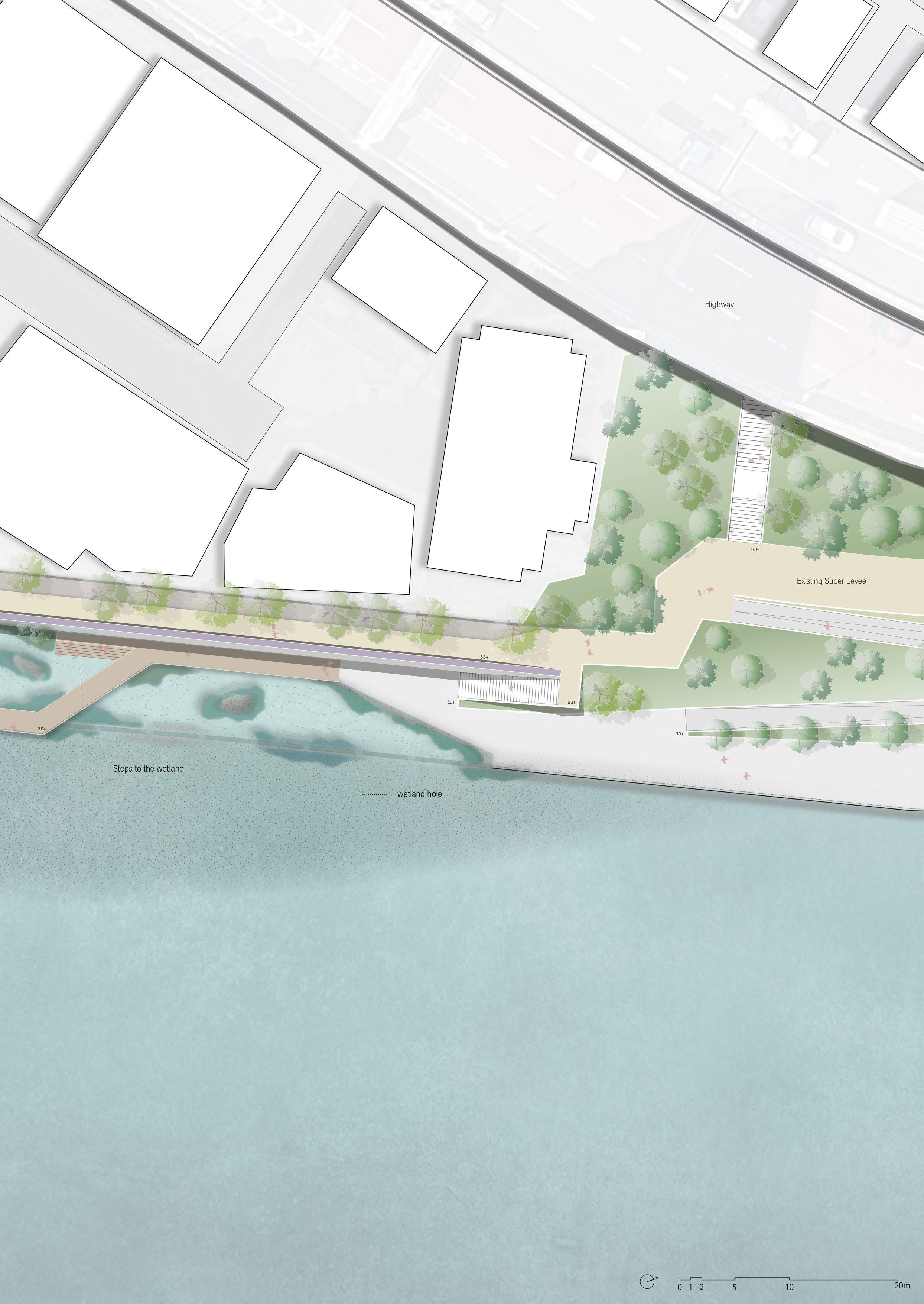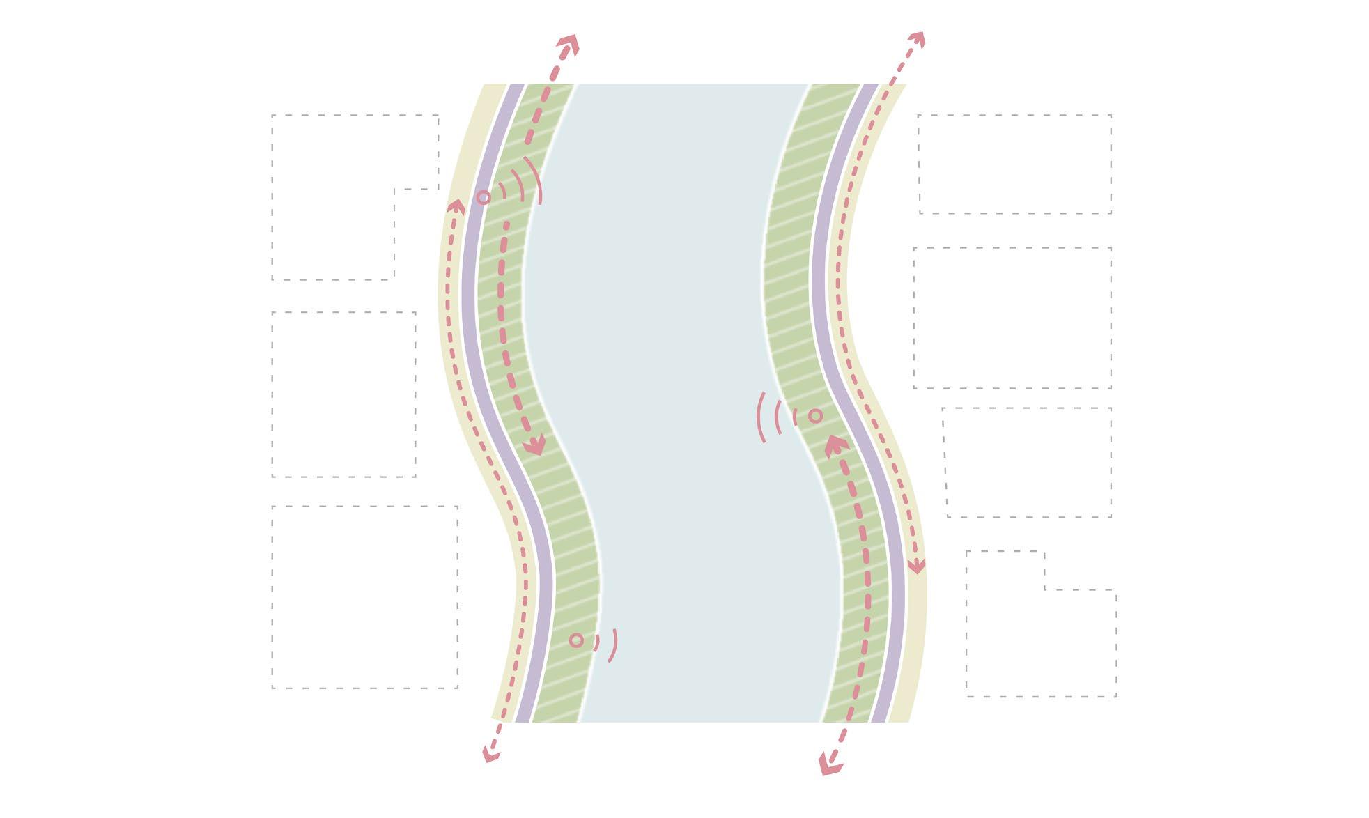 On the opposite bank, the outer curve of the river has fast-flowing currents, so the existing hard quay wall remains here. To introduce the flow of creatures from the Eco tone as stepping stones on the opposite bank, the river space aims to design a small natural area with forest elements.