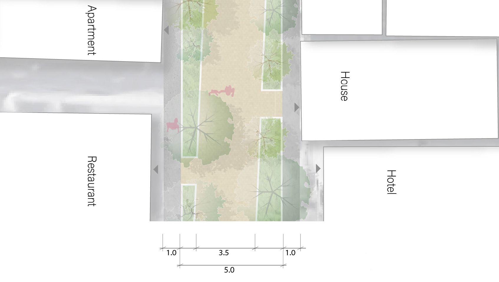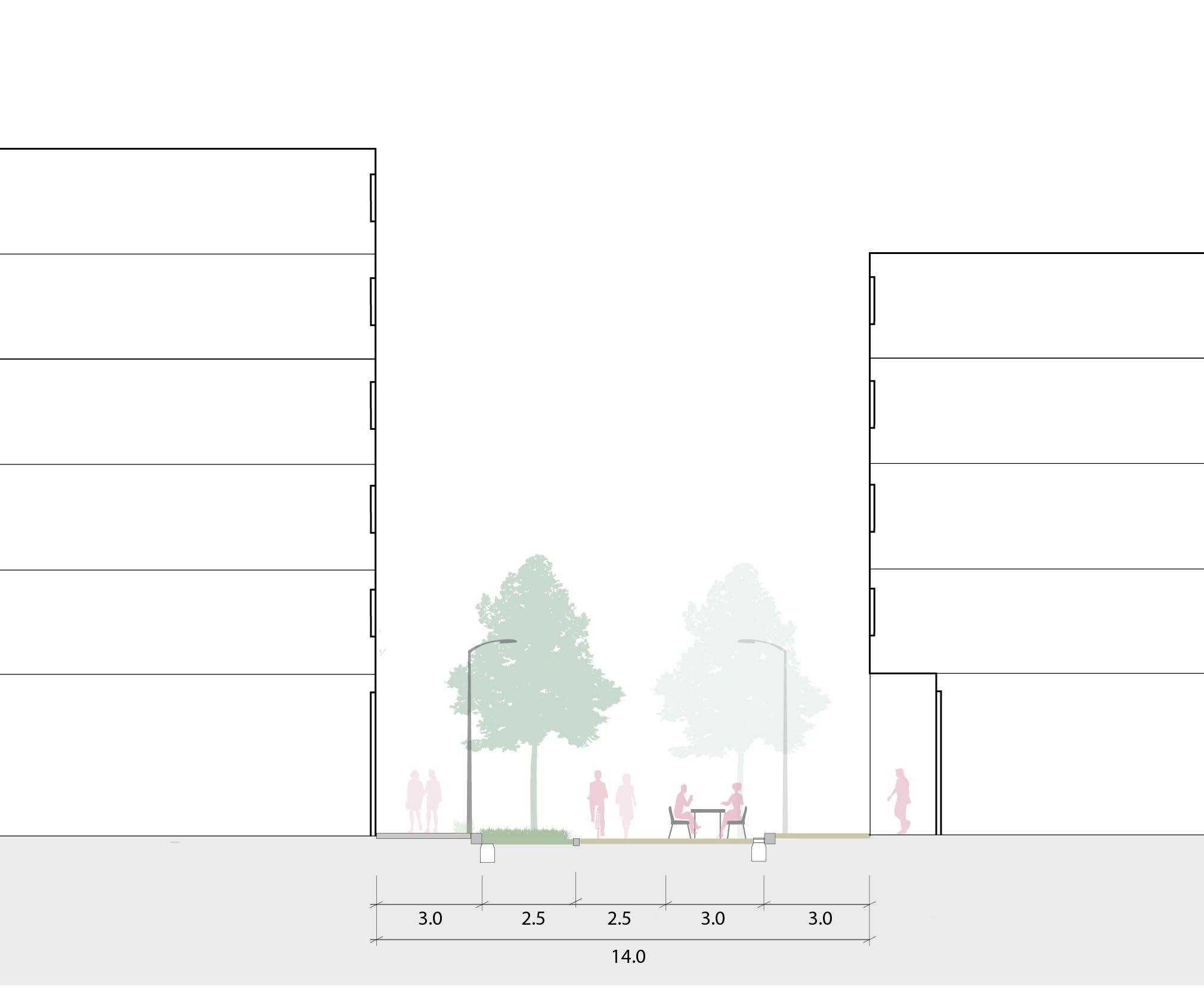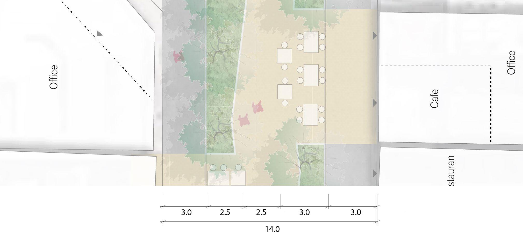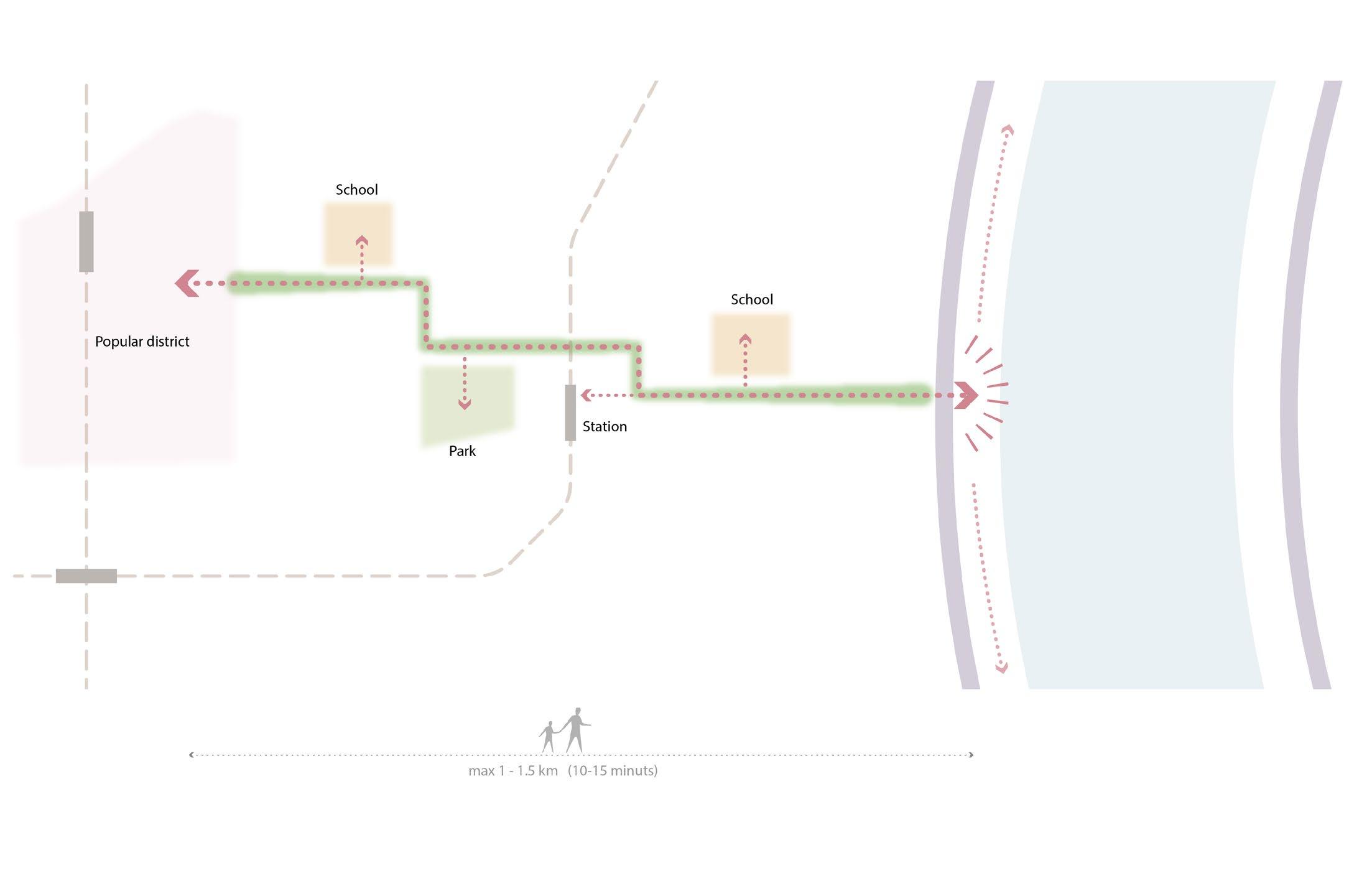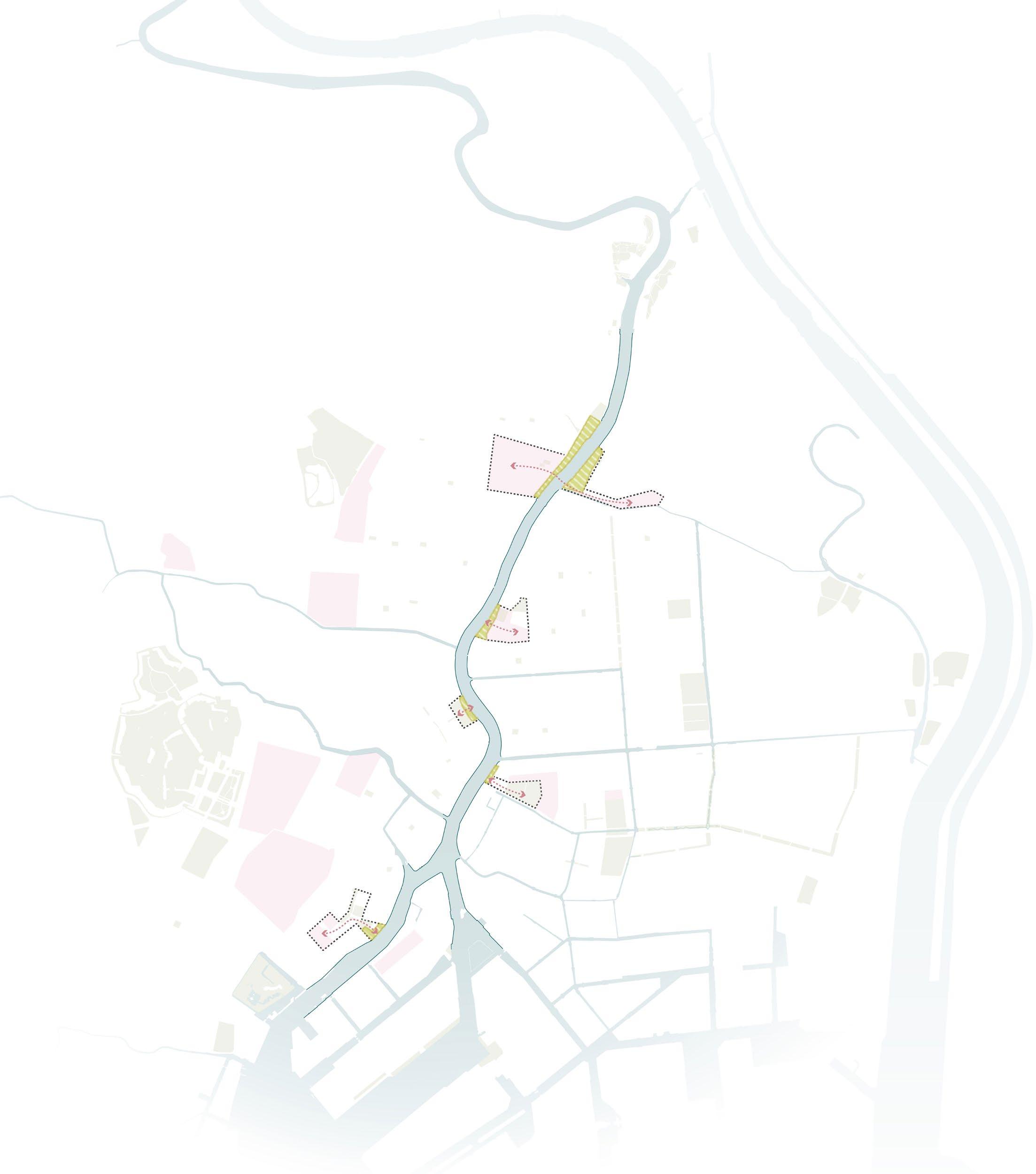 On the opposite bank, the outer curve of the river has fast-flowing currents, so the existing hard quay wall remains here. To introduce the flow of creatures from the Eco tone as stepping stones on the opposite bank, the river space aims to design a small natural area with forest elements.