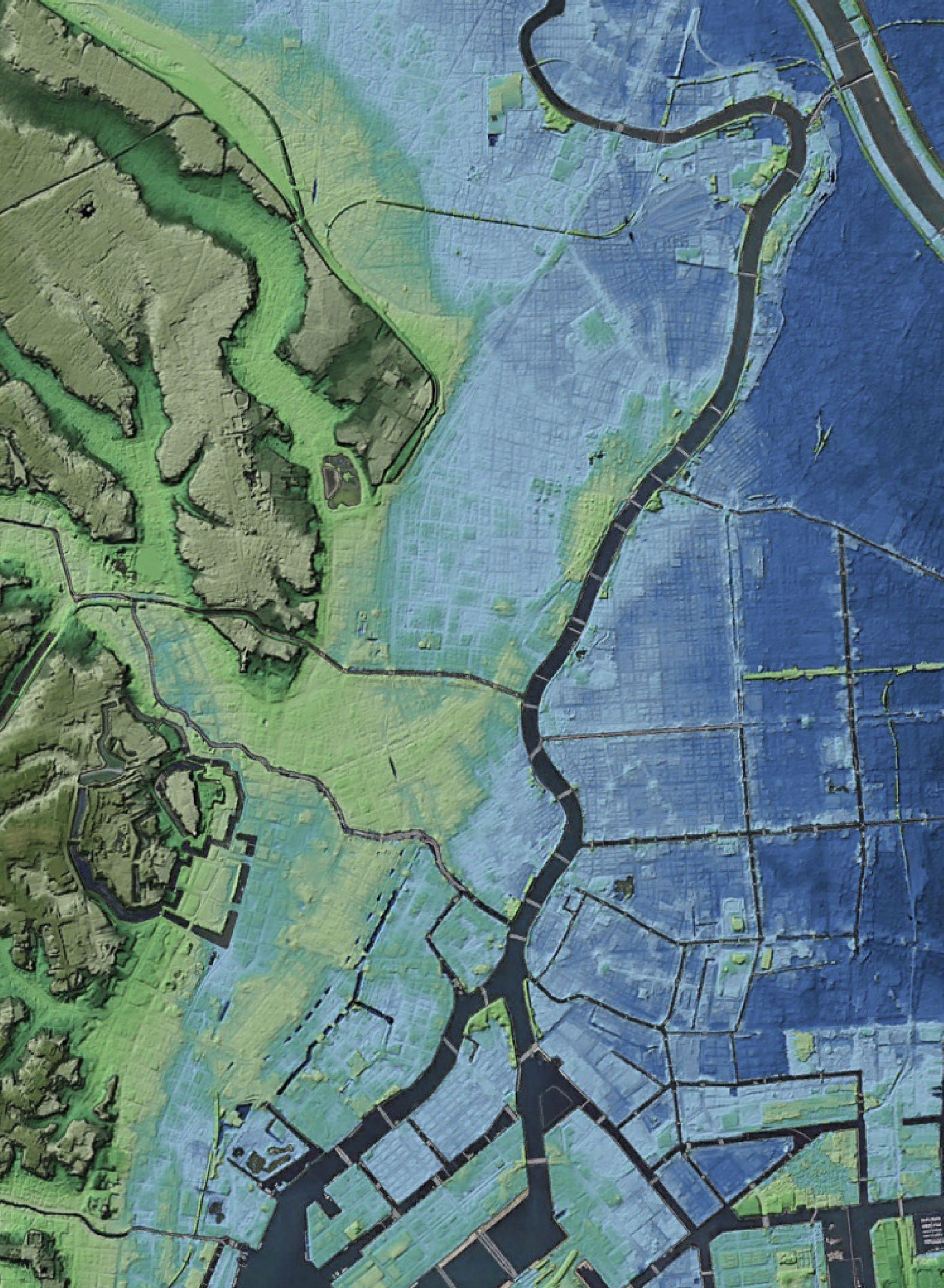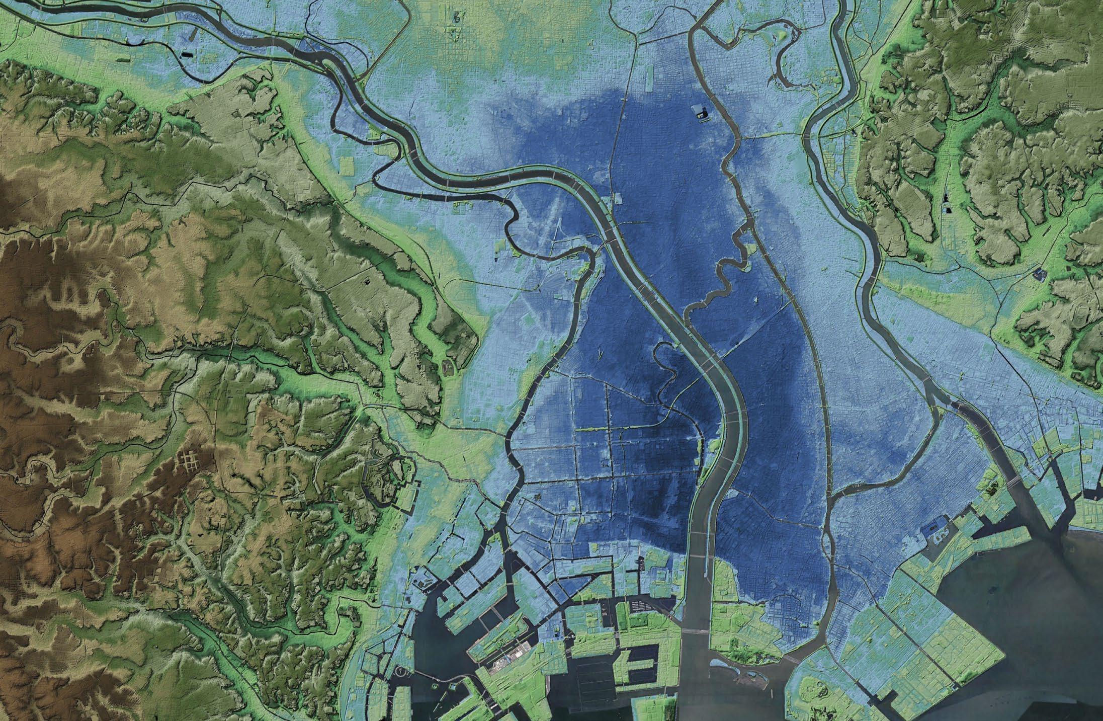 Those maps show the flooding area when the sea water levels will increase in the future (flood protection is not included). Because of most of the low land, most of the eastern area of the Sumida River will be flooded. To protect the land, Tokyo needs to continue to have robust flood protections.