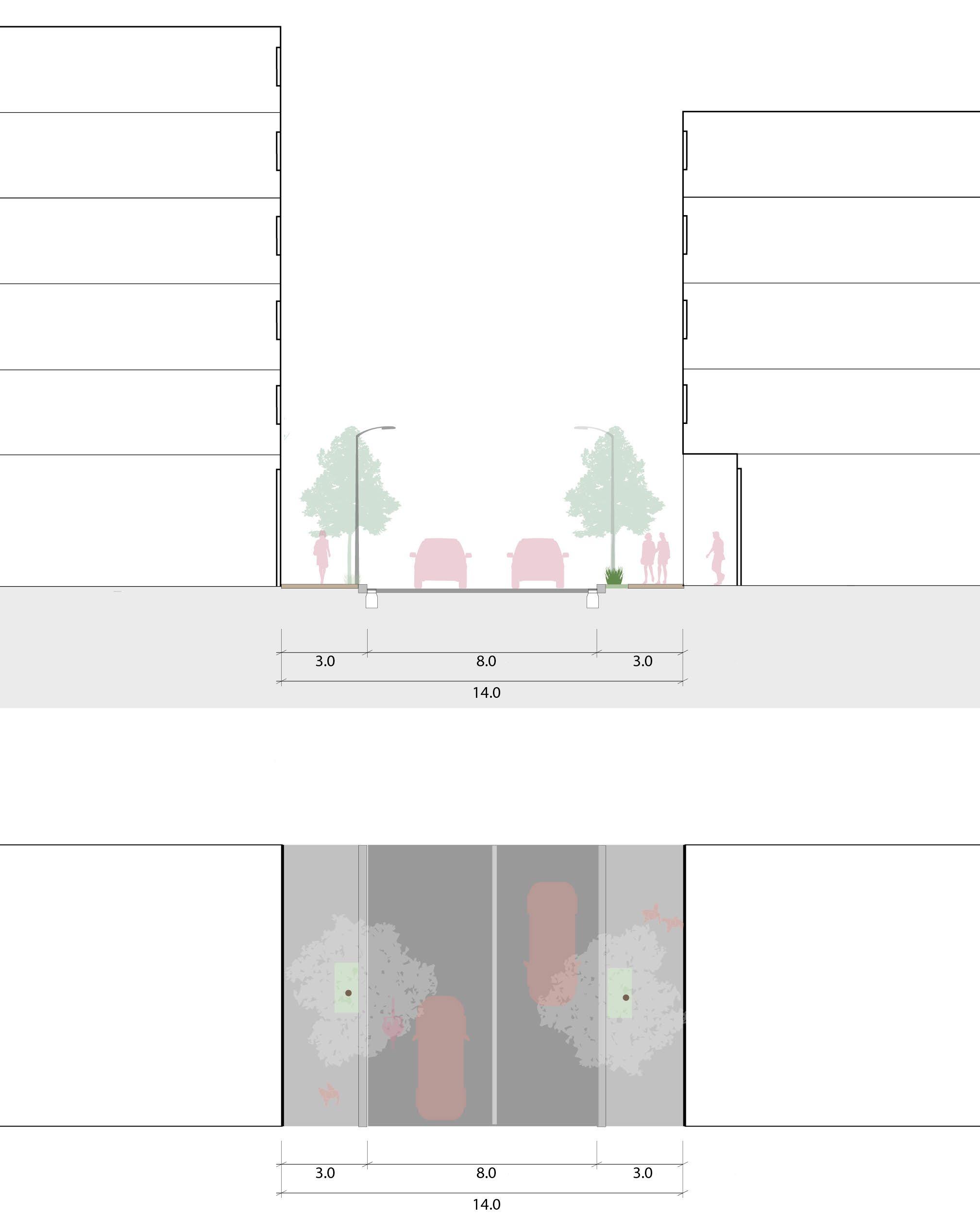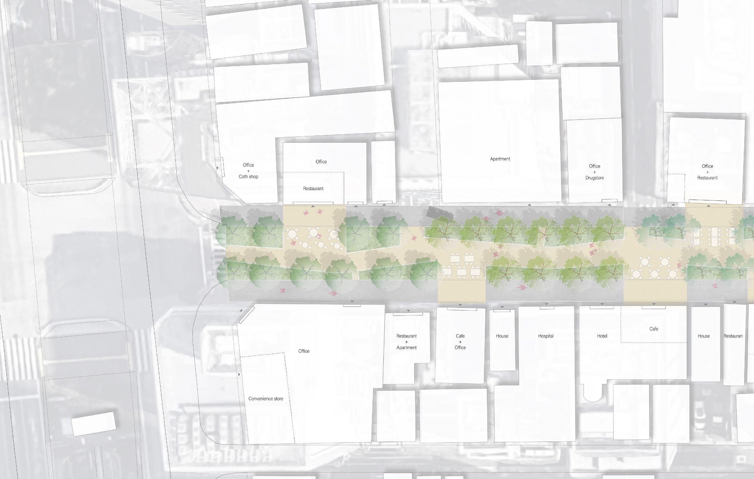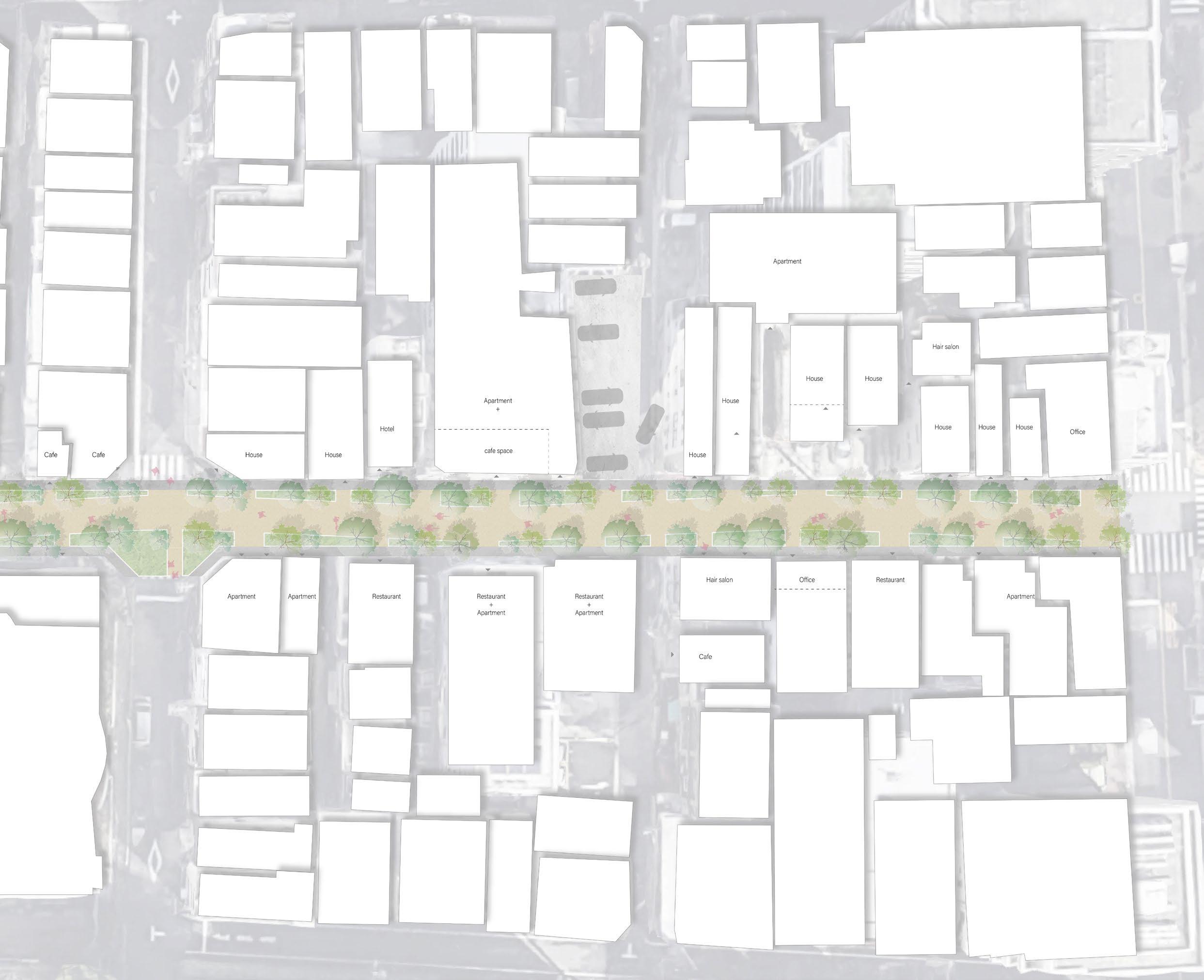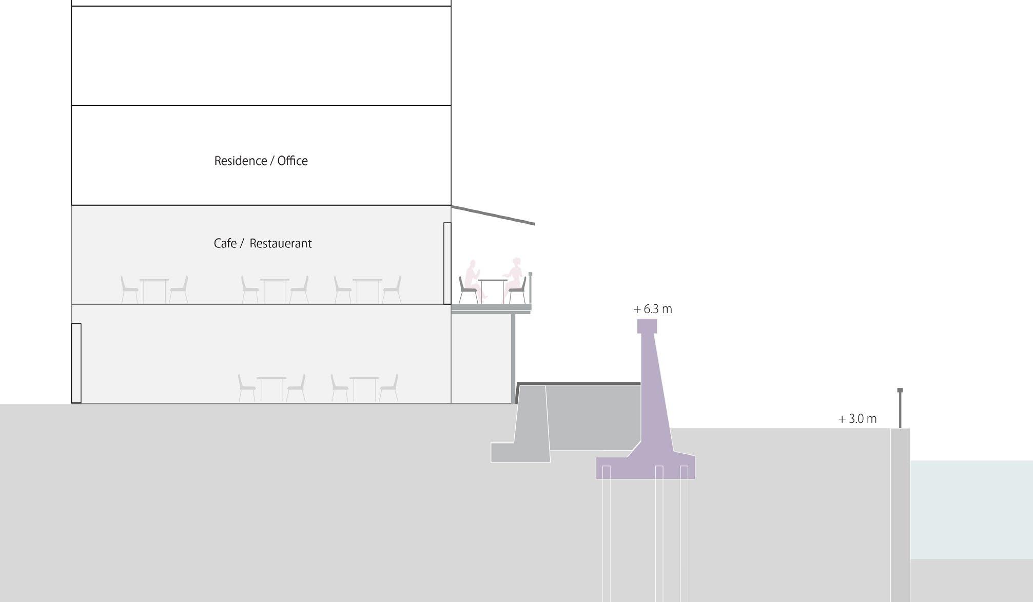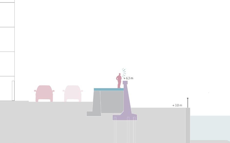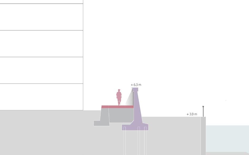 Currently, most of the space between the flood wall and buildings is almost dead space. Introducing pedestrian flow in this space creates an opportunity for new cafes and shops with entrances facing the river. This design has the potential to inspire new typologies in future architectural designs with the connection of the pedestrian path along the river.