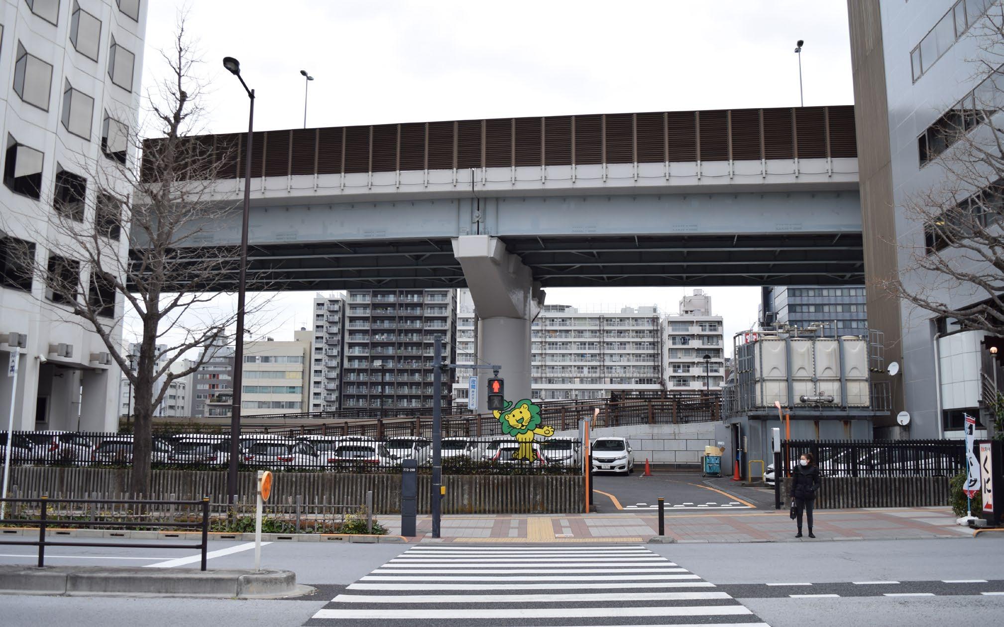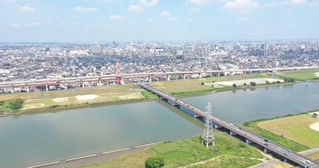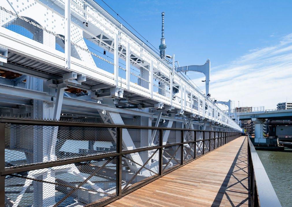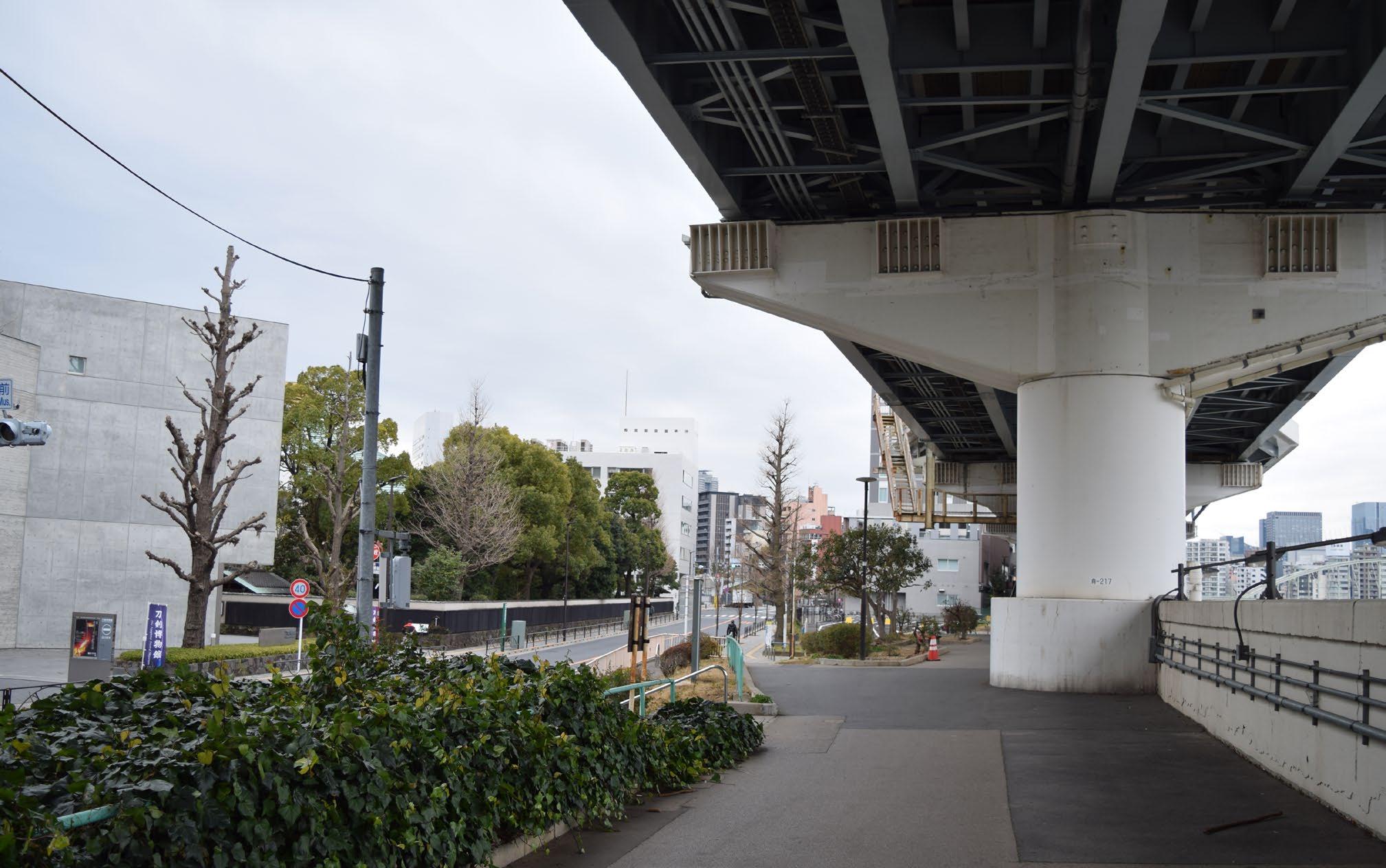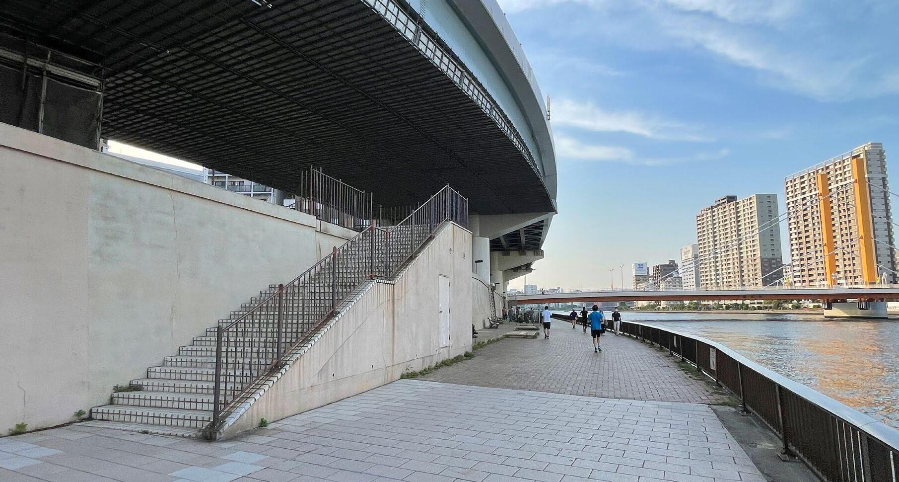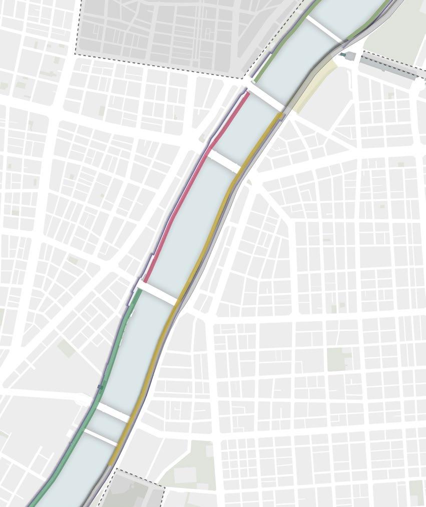 In the area east of the Sumida River, there are no buildings standing along the river because of the elevated highway, and a two-lane road runs north-south next to the floodwall. Here, the location of the floodwall is moved toward the road to expand the river space and make the space under the elevated highway function as an activity space for people.