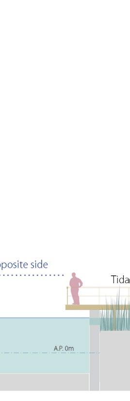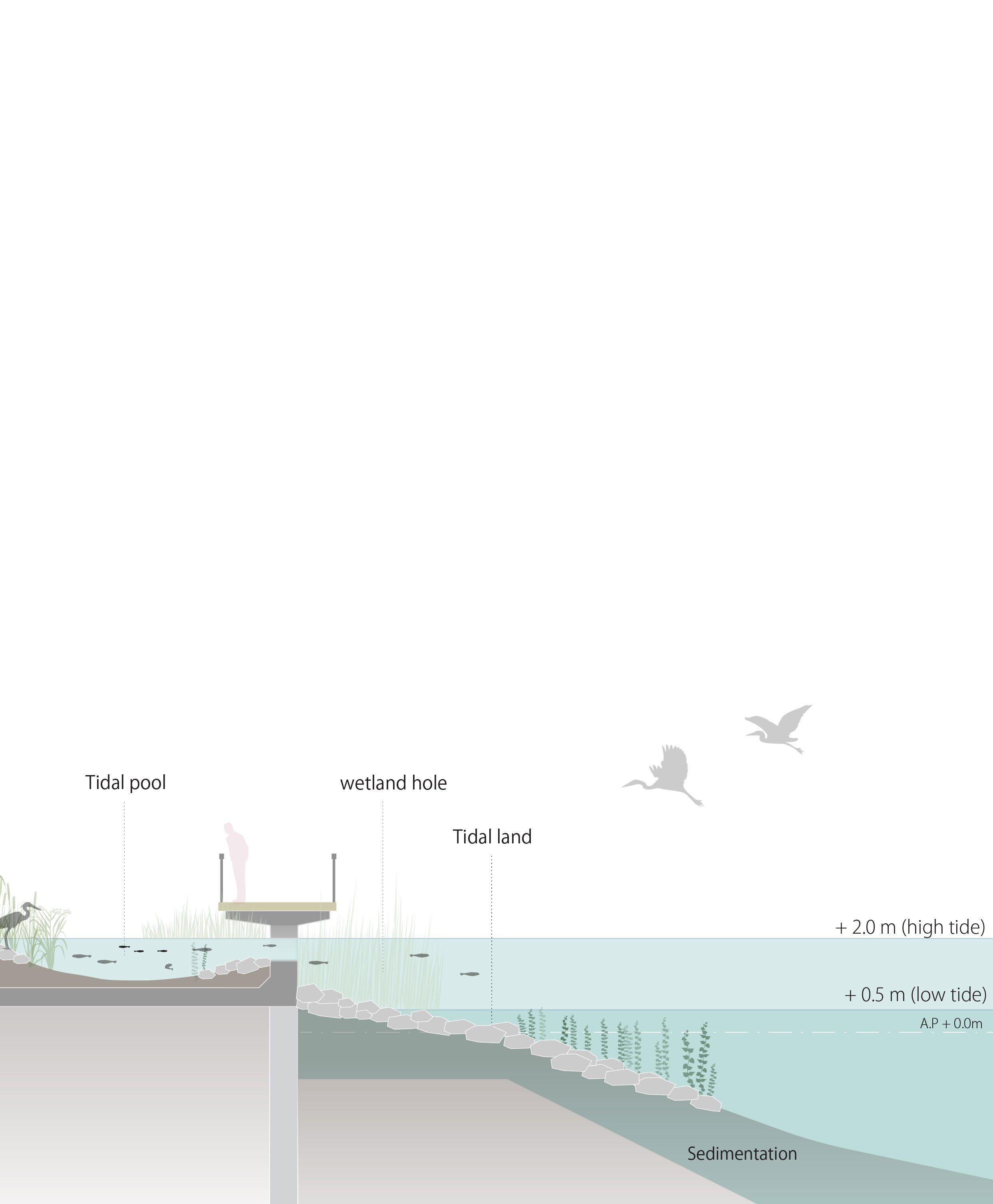 Taking inspiration from this sediment-formed tidal land, the concept of this area is to leave the sediments on the inner river without dredging and to create a soft edge in the urban river where living creatures can habit.