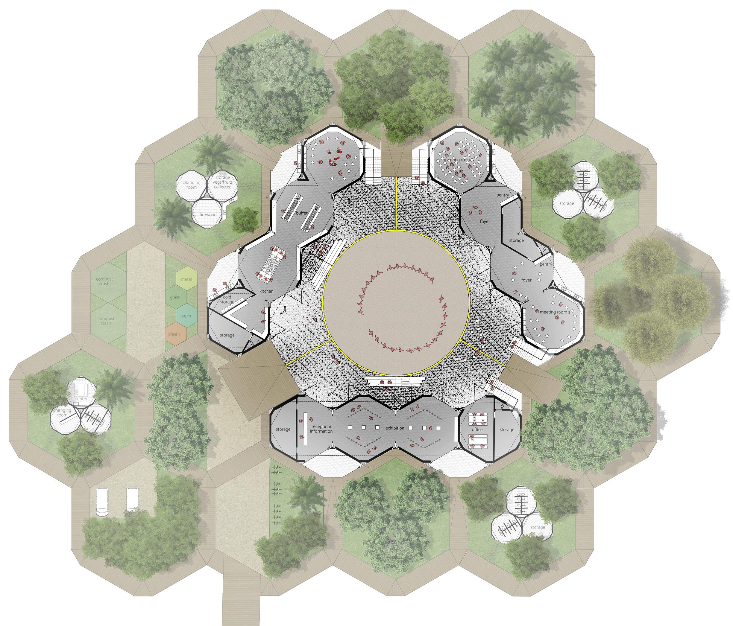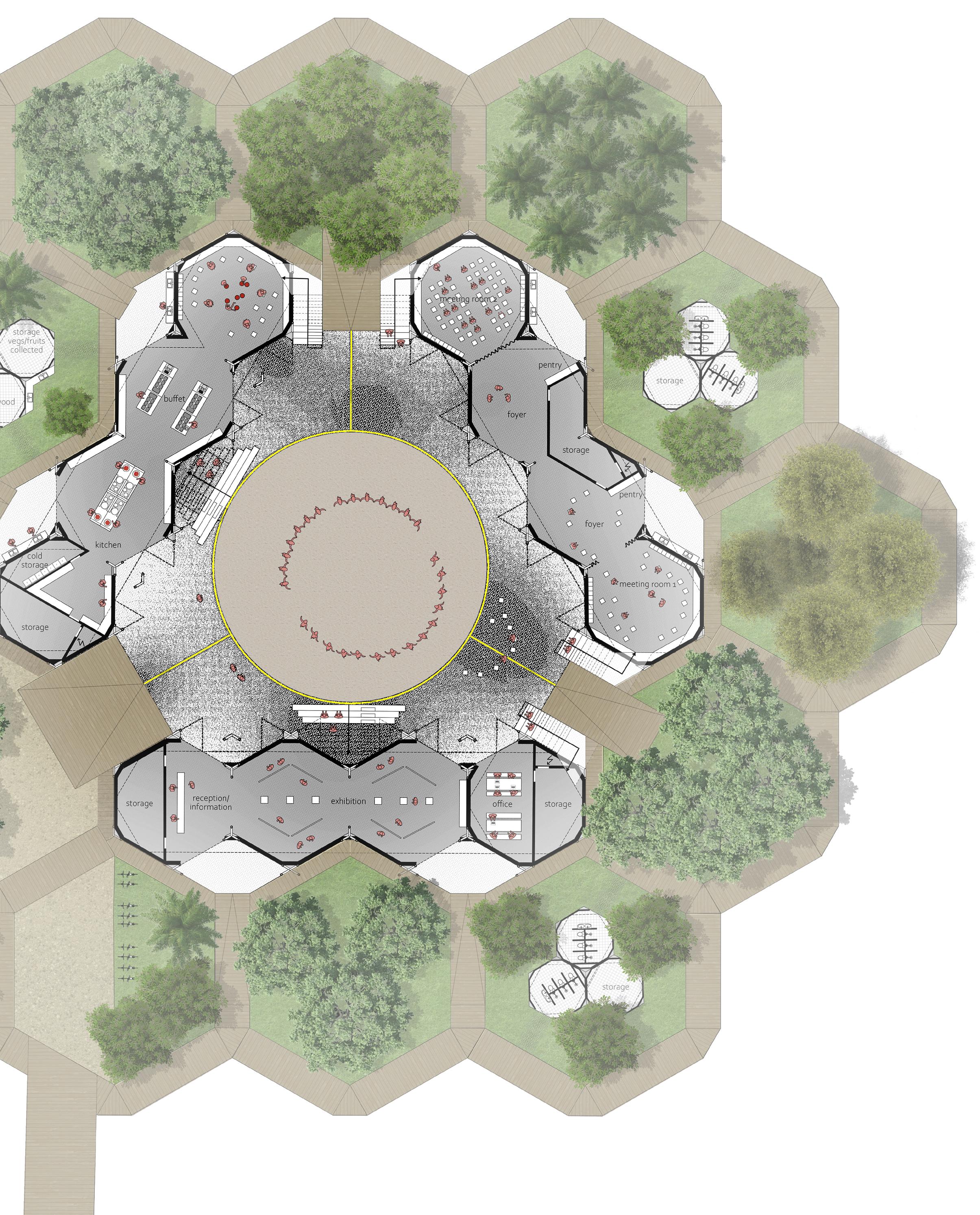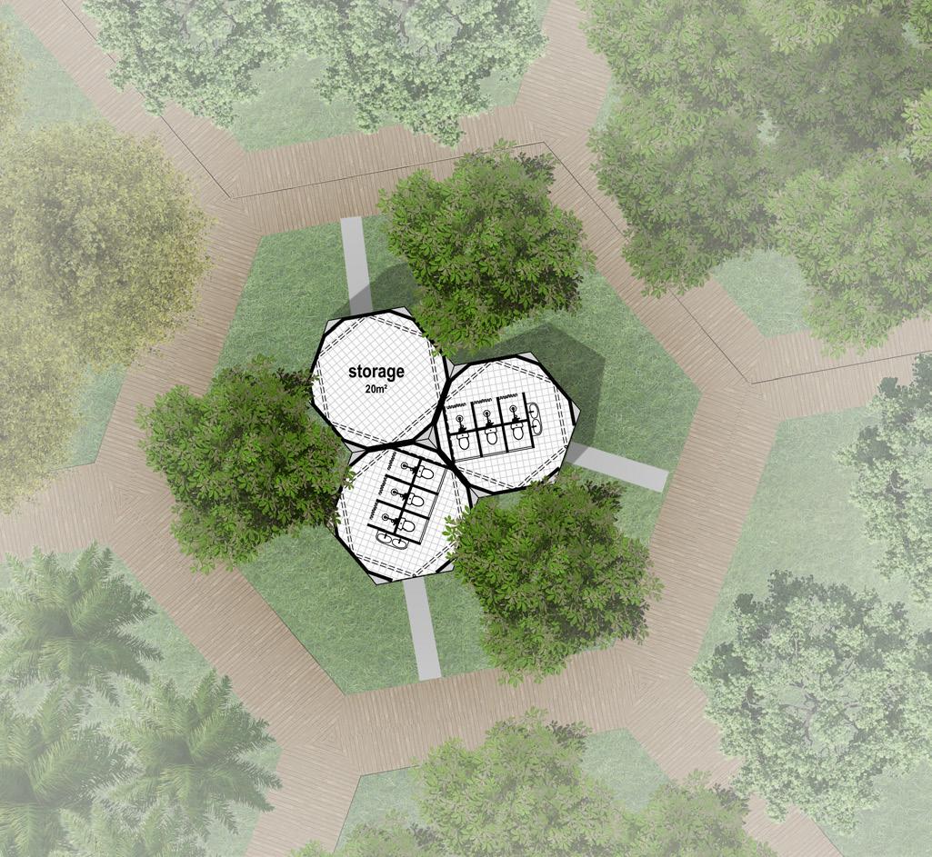 In this park it is possible to experience nature in differents ways. It is possible to get lost through the hexagons, but you can also use the paths. The red paths in the map are alternative ways, their structure is fixed under the ground and because the hexagons are floating you will see and perceive the park different