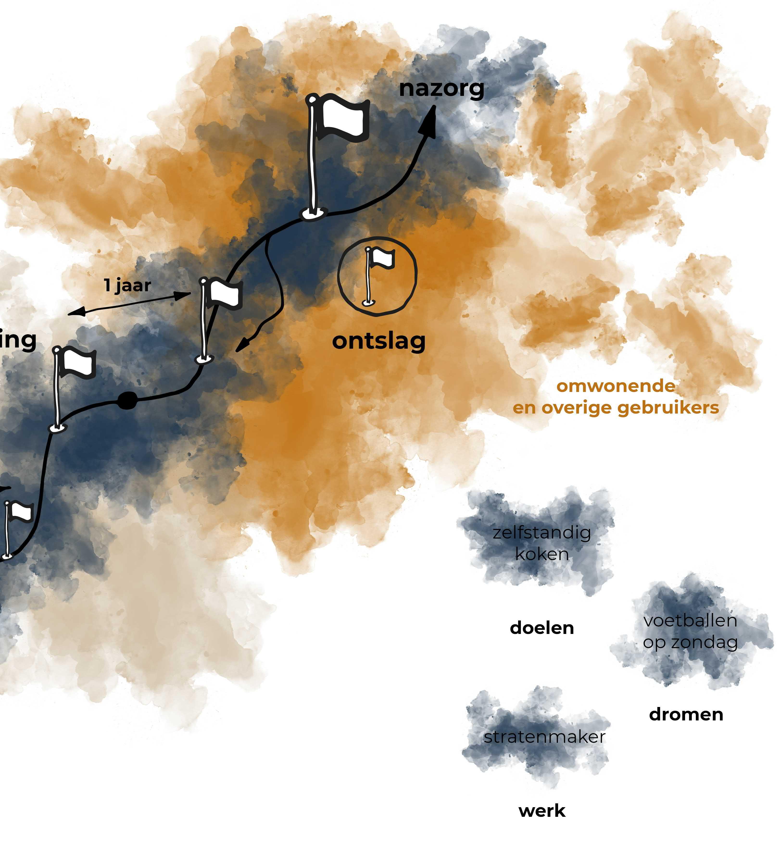 Ze staan er tenslotte niet alleen voor, maar helpt het om erover te praten en de confrontatie aan te gaan. Maar op welk punt in het revalidatieproces zijn de cliënten er aan toe om andere mensen te ontmoeten? Wat als we het gesloten karakter van een revalidatiekliniek meer openstellen, de maatschappij binnenhalen en de verschillende gebruikers elkaar laten ontmoeten om onder andere ervaring en kennis te delen?