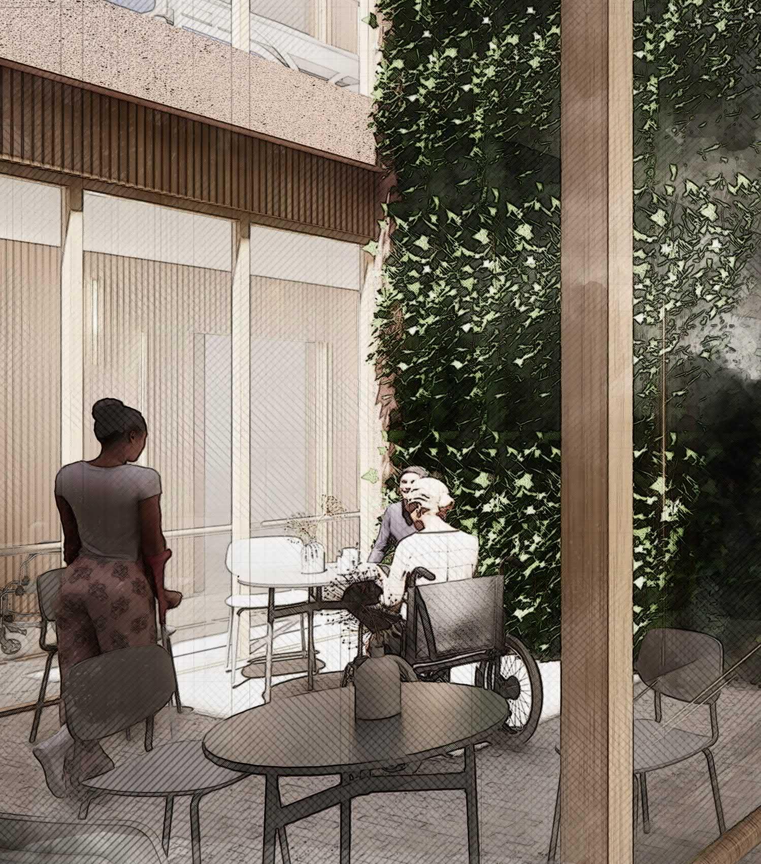 De binnentuin is het middelpunt van de genees heer, waar voor iedereen ruimte is en grotere groepen samenkomen. De revalidatiekamers zijn als hofwoningen rondom de binnentuin gesitu eerd en is er de mogelijkheid om jezelf volledig af te sluiten, maar ook de mogelijkheid om de binnen tuin onderdeel te maken van je kamer door de vouwpui open te zetten.