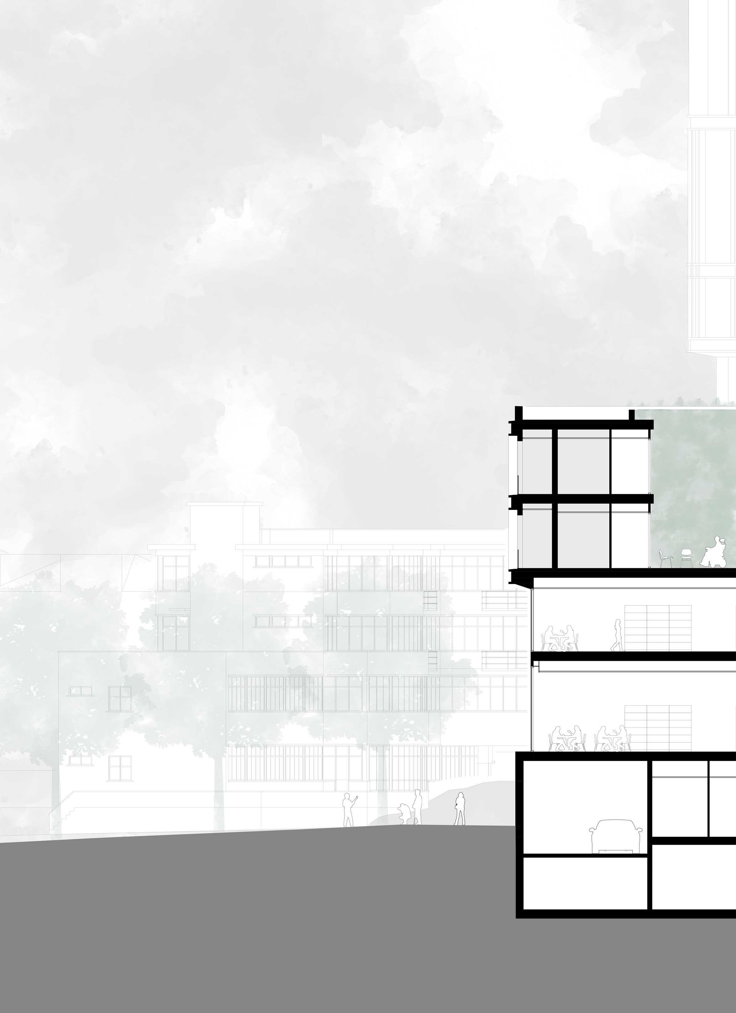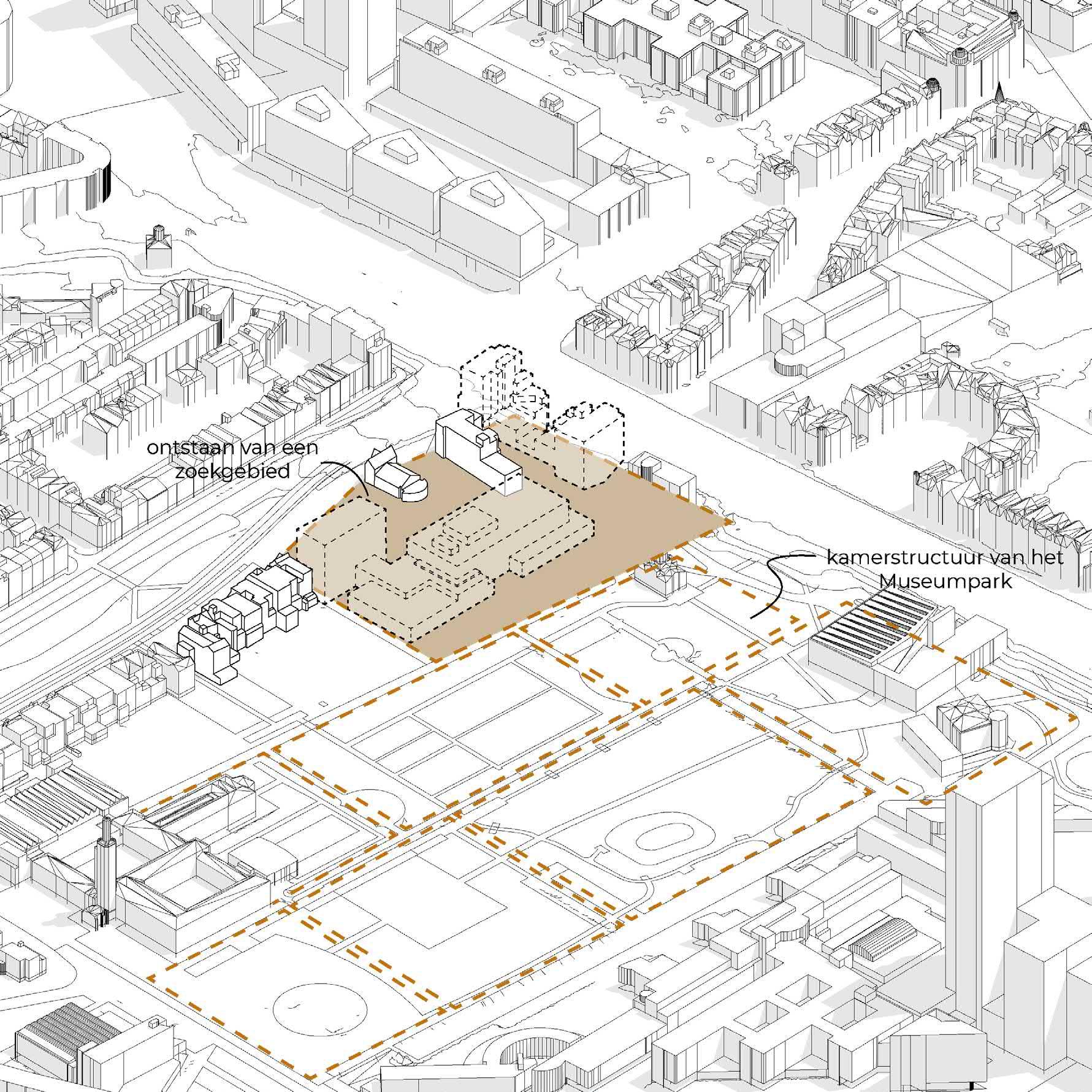 Daarnaast is het collectieve geheugen van Rotterdam voor mij een belangrijk aspect om een plek te realiseren waar saamhorigheid ontstaat, mede door het ophalen van herinneringen. Het project biedt ruimte aan de geschiedenis van de monumenten die er nog staan en helpt het gebruiken van de functie van het voormalige openluchttheater om samen te komen en deze herinneringen te delen. Met het gebruik van de kamerstructuur uit het ontwerp van het Museumpark wordt de projectlocatie onderdeel van deze culturele as.