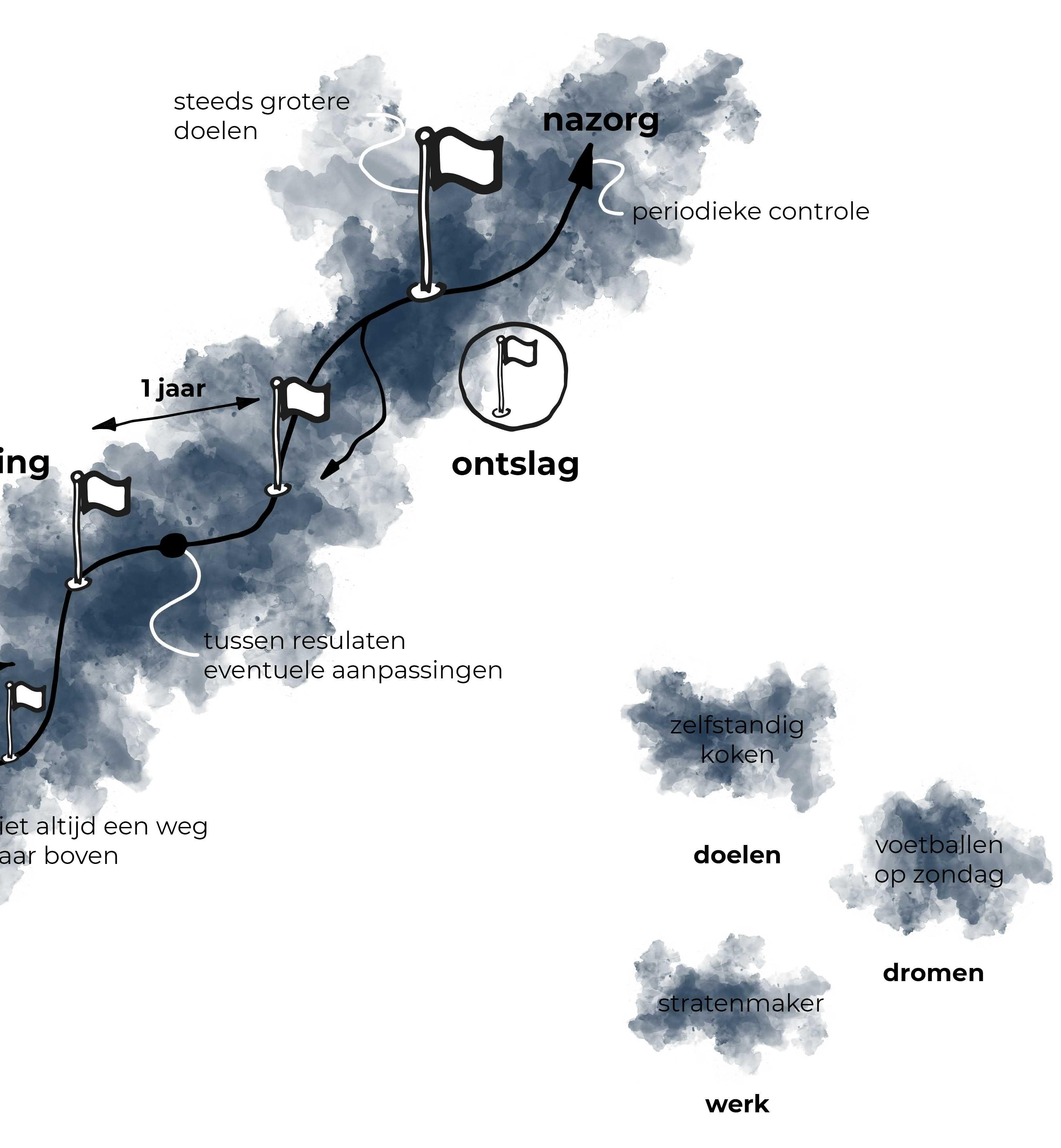 De behandeling bestaat uit drie fases: diagnose, behandeling en ontslag. In de eerste fase van de behandeling wordt er gekeken naar de wensen en mogelijkheden. Doelen, dromen en de werksituatie van de client. Waar specialisten binnen de kliniek samenwerken om deze doelen te bereiken middels een behandelplan. Is voor het opstellen van een behandelplan het ontmoeten van partners, familie en vrienden een belangrijk onderdeel. De behandeling zijn in het begin kleine stapjes. Zeker als je in de kliniek ligt is het vaak nog dichtbij je bed en gaat het steeds verder van je bed af. Er worden doelen opgesteld die steeds groter worden en kan de therapie tussentijds hierop worden aangepast. Uiteindelijk komen ze in de ontslagfase en de nazorg terecht. Het contact met de revalidatiekliniek wordt minder en komen ze nog enkele keren terug voor controle.