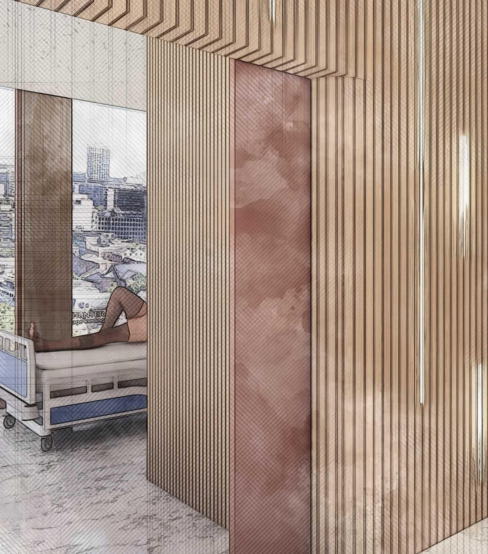 Door het zwembad in de toren te positioneren behoudt de patiënt zijn uitzicht en een connectie met Rotterdam. Naar de rand van het zwembad zwemmen en stil te staan bij het moment brengt tijdens de revalidatieperiode enkele geluksmomenten met zich mee.