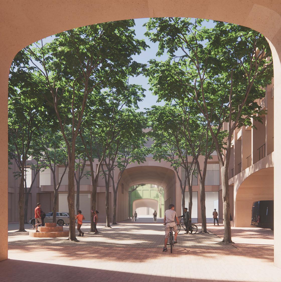 Alleclusterssamenvormeneenommuurdetuinwaarindebinnenplaatsenvoororiëntatie zorgenenhetstedelijklevenopgepasteafstandtoelaten.Aandebinnenplaatsenzijnalle ondersteunenderuimtesengemeenschappelijkefunctiesgesitueerd.