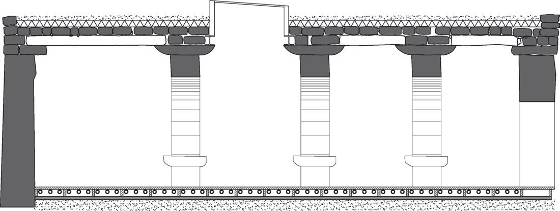 To solve the problem of light in the spaces, I implemented a skylight system which provides an ample amount of light by using two different sizes of skylight elements. It’s a timber structure added to the roof, where we can remove part of the compacted soil layer and the secondary beams from the roof to accommodate the skylights. As depicted in the photo of the collapsed roof, the layers of the roof structure are visible.