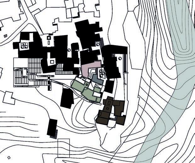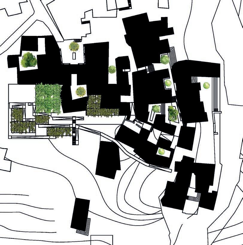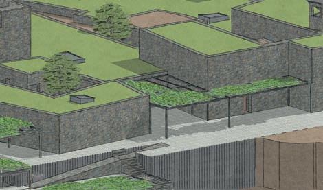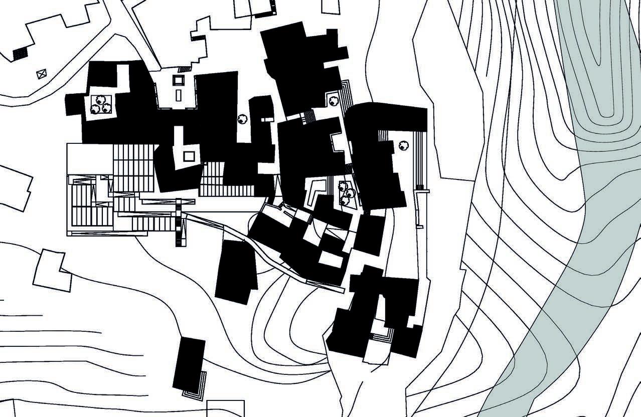 Starting with the program of the entrance zone, which comprises three main buildings serving as the reception for the community center and the primary connection with the village.