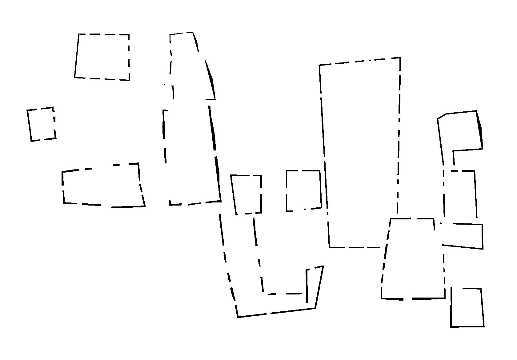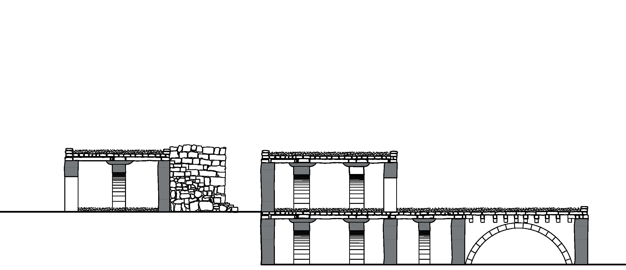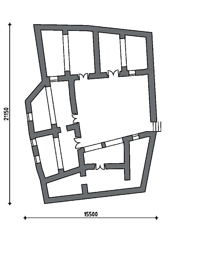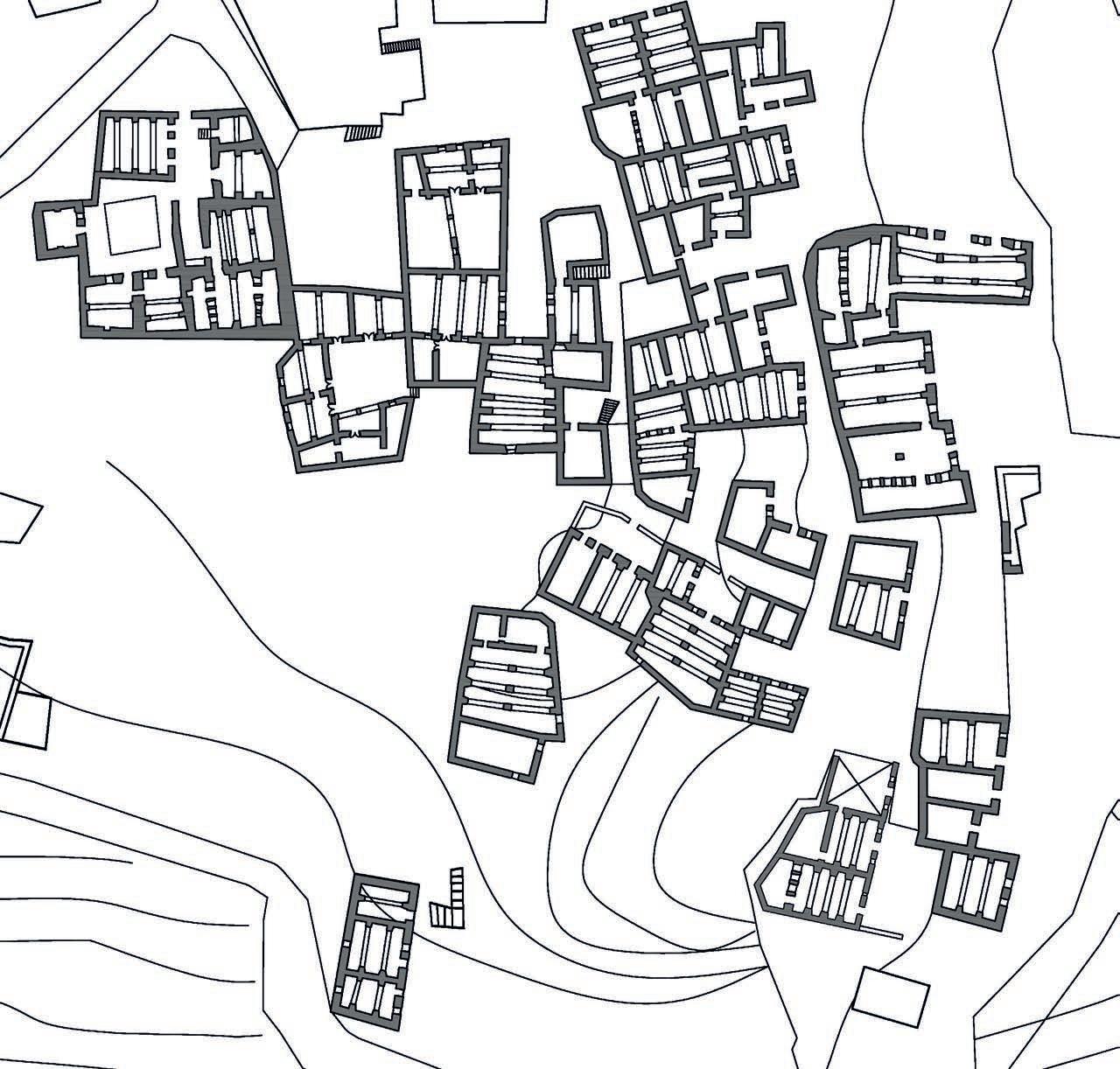 This housing block consists of three houses with almost the same typology, which is the courtyard typology. The first one comprises 8 rooms around two courtyards, while the second one is smaller, featuring 5 rooms and one courtyard. The third house takes the U shape on the ground floor and could be either one large house with entrances to the spaces from the courtyard or three small houses. The first floor includes two rooms.