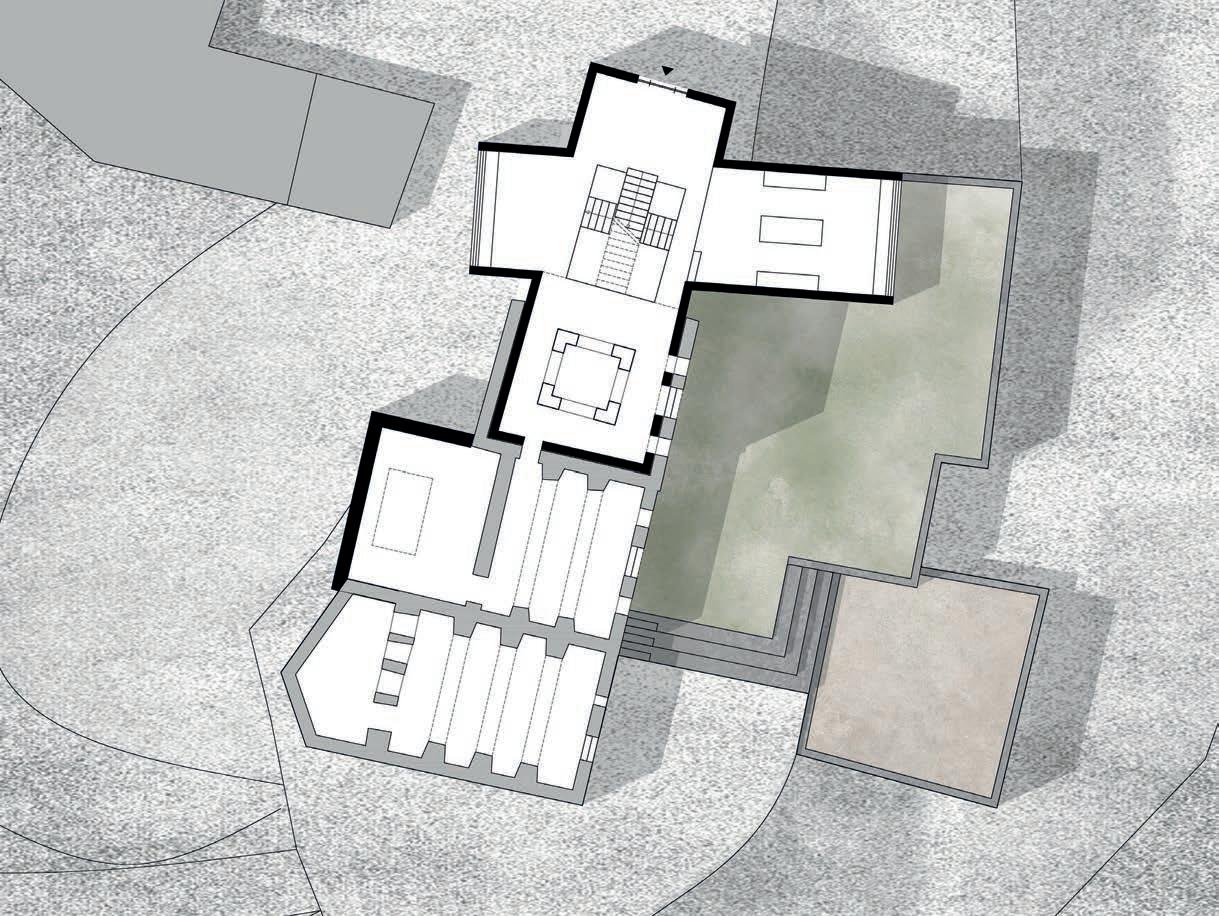 This space will be open to the ground floor and first floor and will receive light from the skylights in the roof. In the darker areas, I placed a sanitary space for the library. From this level, there will be a connection to the outdoor spaces through the existing doors.