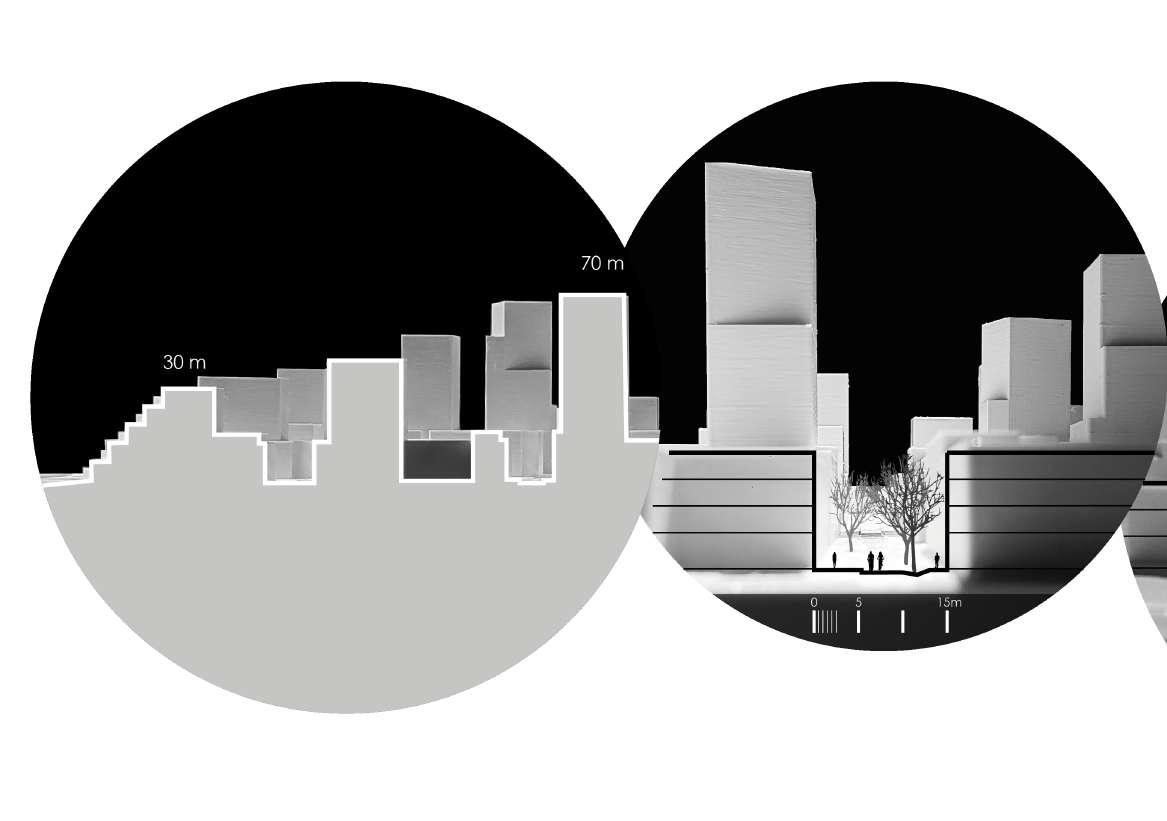 De bebouwing heeft een oplopende basishoogte van vier bouwlagen aan de rand naar zes bouwlagen nabij het station. In elk bouwblok is er een hoogte accent aanwezig. Net als bij de basishoogte zijn deze nabij het station maximaal 70 meter hoog en lopen deze af naar een hoogte van minimaal 30 meter. Dit draagt bij om het kerngebied een hoog stedelijk karakter te geven waar juist de randen aansluiten op de maat en schaal van de bebouwing in Zwolle.
