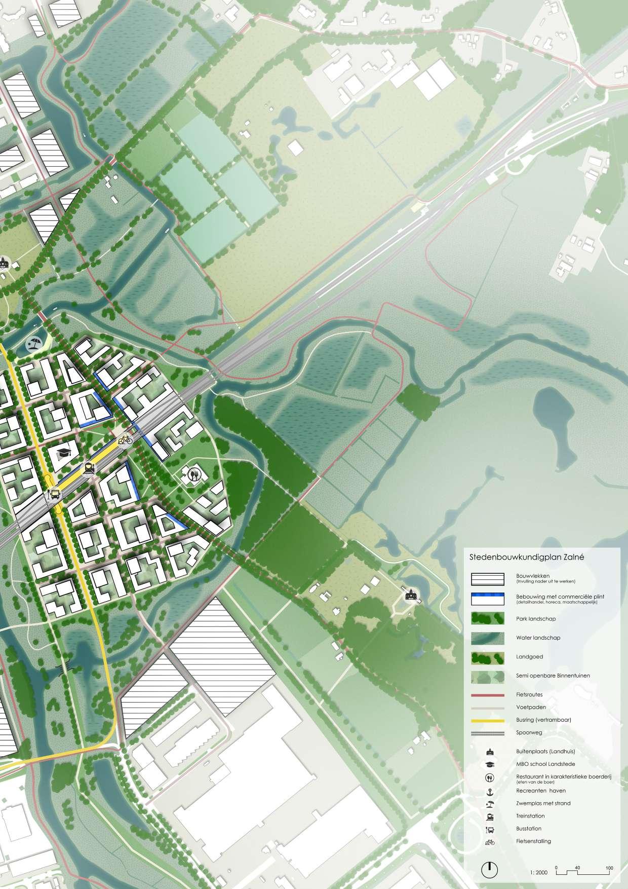 De onaantrekkelijke en anonieme stadsrand van Zwolle illustreert duidelijk waar de auto de grootste impact heeft gehad. De stadsrand de plek waar de meeste thema’s bij elkaar komen en waar het in de huidige situatie vaak mis gaat. De gemakkelijkheid van de auto heeft ervoor gezorgd dat het een nietszeggende plek is geworden. In de toekomst zal deze plek juist de meeste kwaliteiten krijgen door: de nabijheid van het recreatieve, natuurlijke en diverse landschap, de goede bereikbaarheid door de OV-ring, een stedelijk wijkcentrum en de landschappelijke scheg. De stadsrand Zalné wordt een nieuw stuk stad met een treinstation, vele voorzieningen, MBO school en ongeveer 8000 extra woningen. Dit plan is alleen mogelijk als de intrinsieke waarde en kwaliteit van de leefomgeving centraal staat in de integrale opgave van de regio.