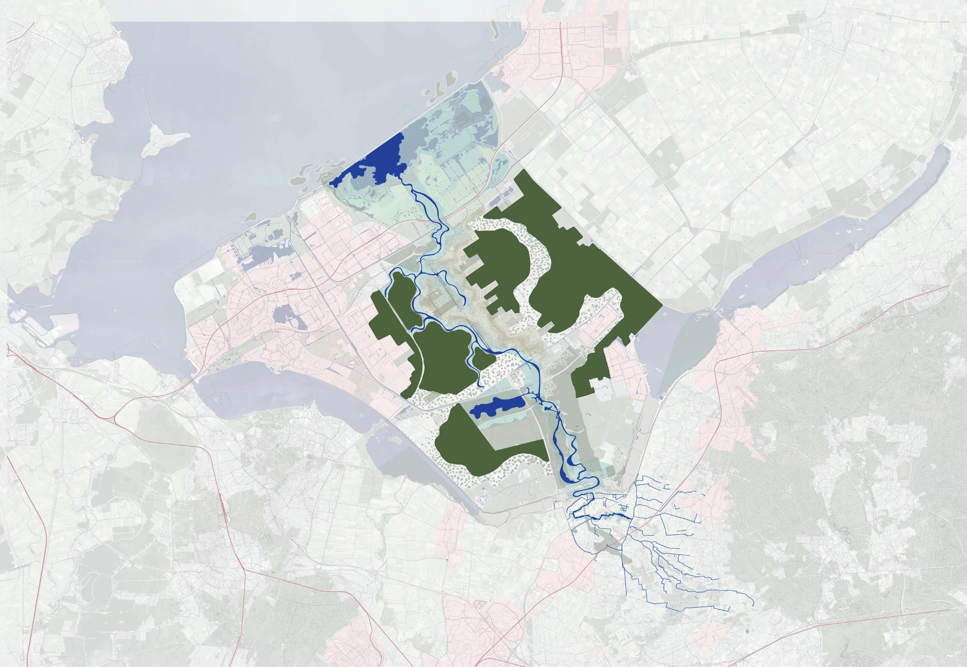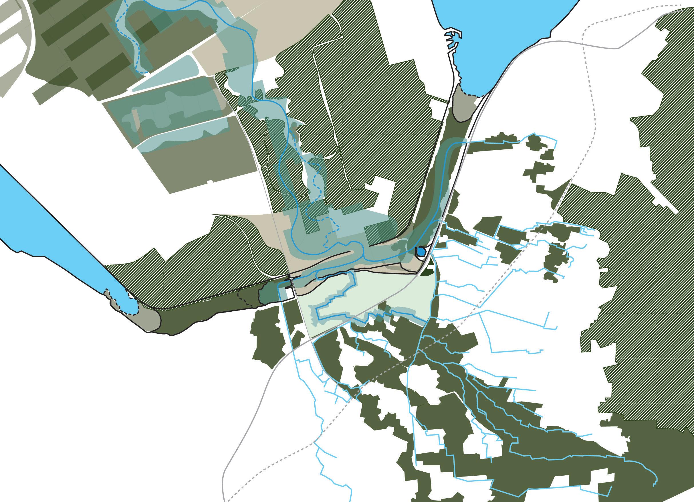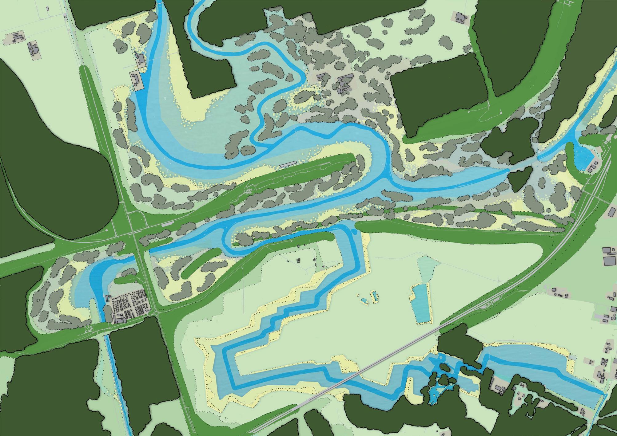 Totaalbeeld van Populieren-Wilgenbos, water- en faunacorridor, ontsluiting en ontwikkelde centra.