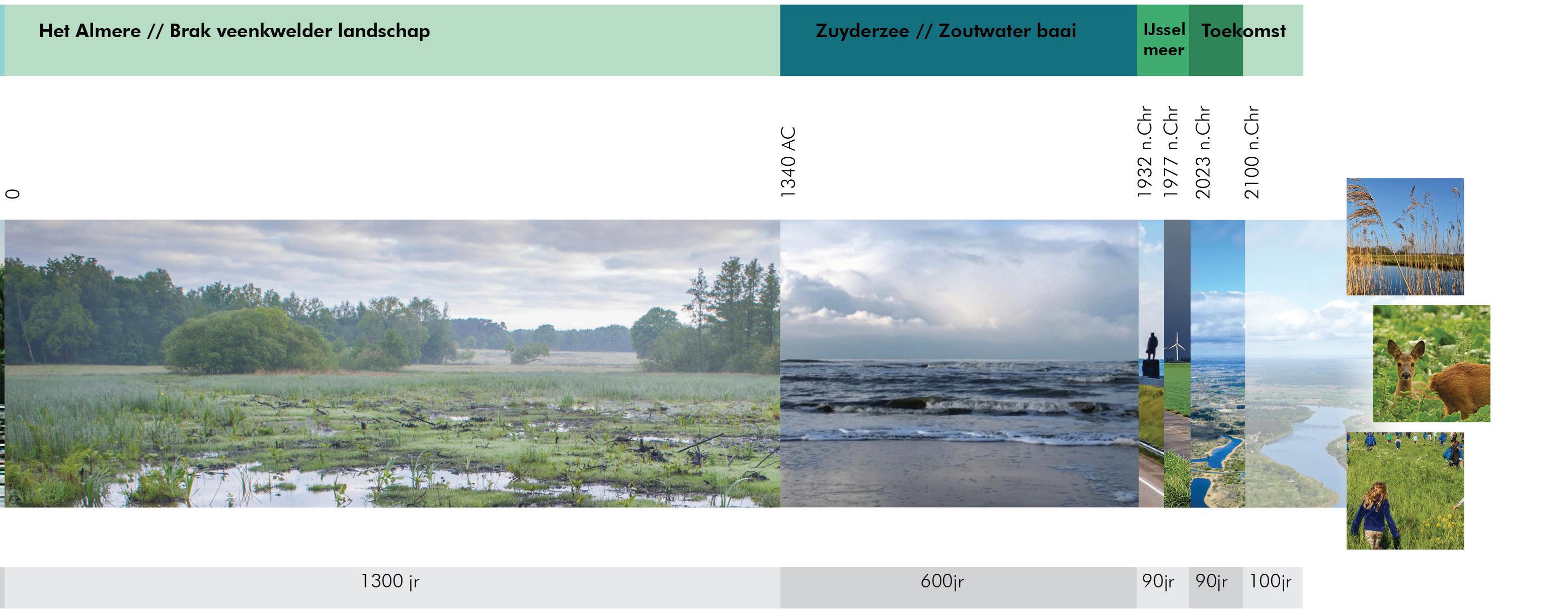 Maar de verhaallijn over Flevoland als provincie ‘op de bodem van de zee’ schetst een incompleet beeld en heeft alleen betrekking op de recente geschiedenis van dit gebied. Kijken we verder terug, dan zien we een gebied dat is gevormd door stuifzand, zoetwatermeren en veen, waar zowel klei en rivierklei als sediment over zijn afgezet.