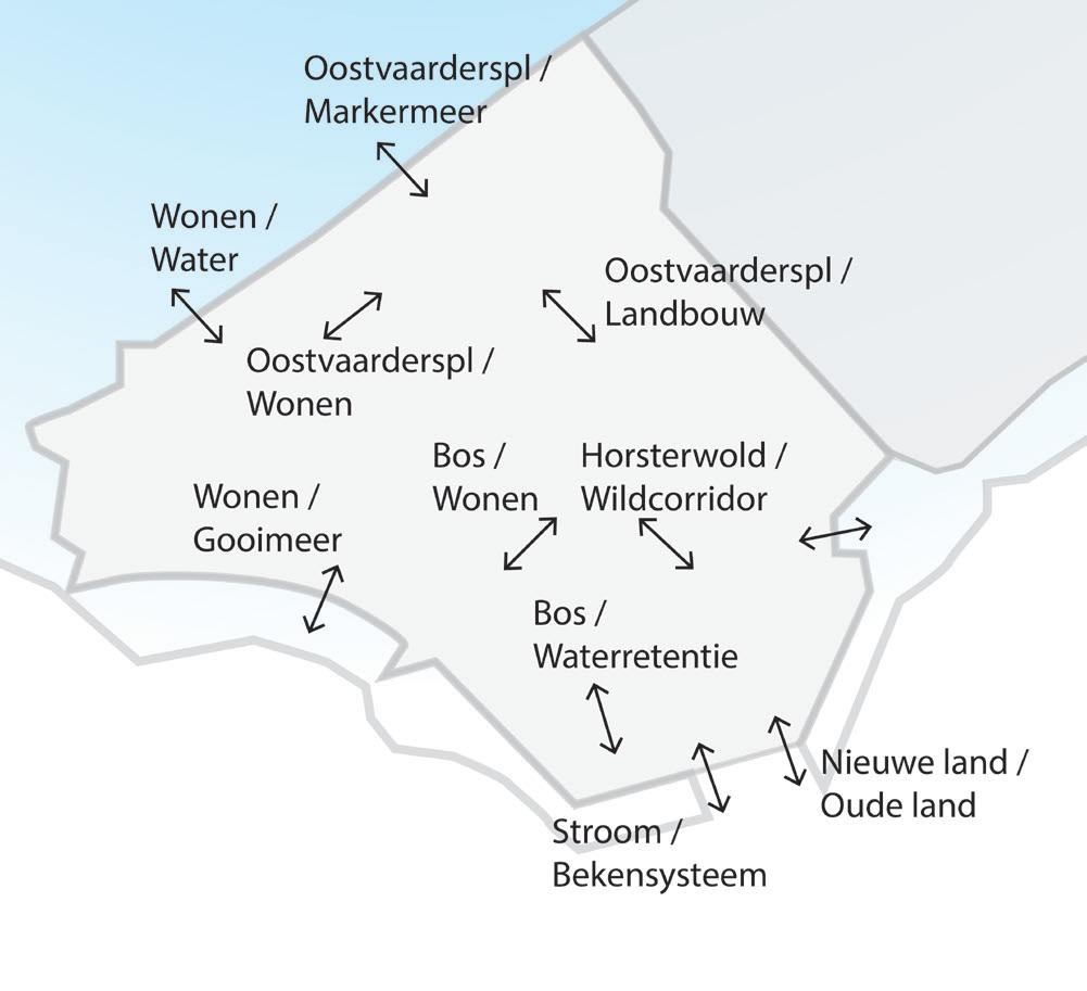 Gescheiden functies in de ZIJP, v.l.n.r. wonen, natte natuur, bos(bouw) en landbouw.