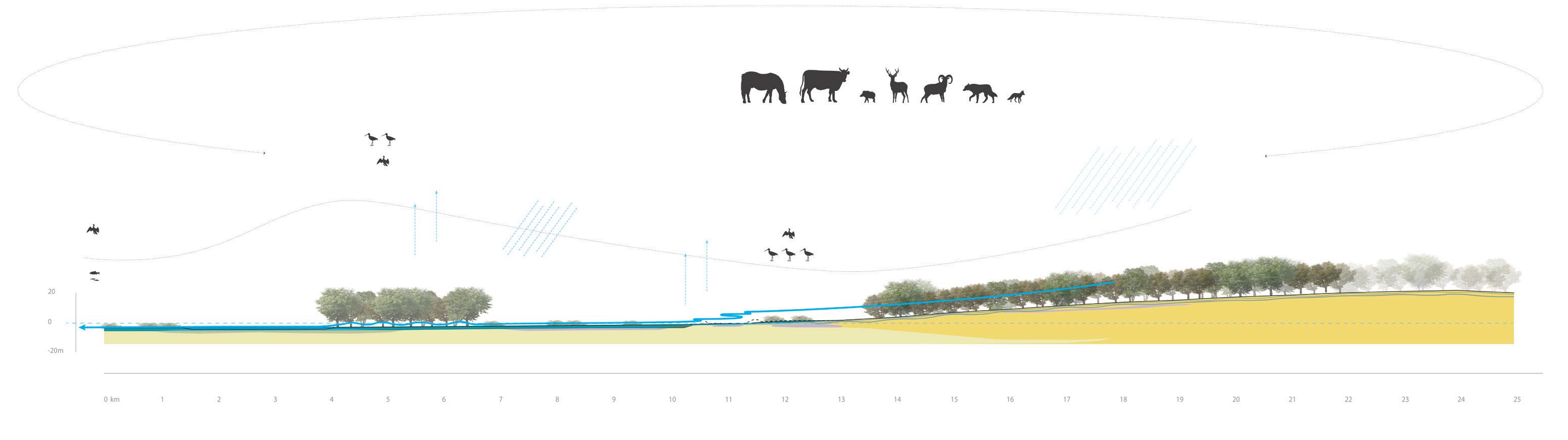 Door de verhogingen kunnen er verschillende routes voor wild ontstaan, afhankelijk van de waterstand. De wegen van mensen, dieren en water kruisen elkaar waardoor meanderende routes ontstaan voor alle gebruikers.