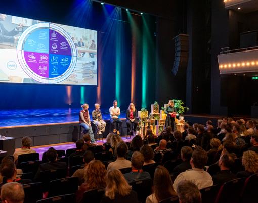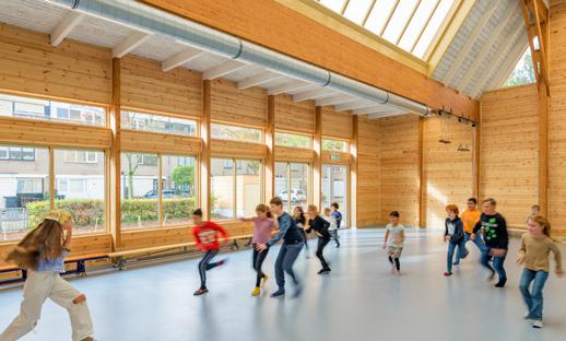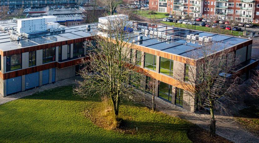 de daglichttoetreding. Houten overstekken en lamellen reguleren de lichtinval en de binnentemperatuur. Architect Daan Josee van Maas Kristinsson Architecten: “Met de overstekken sturen we op het licht en de warmte die via de zon het gebouw binnenkomt. Zo halen we het hoogst mogelijke rendement uit een natuurlijke energiebron.”