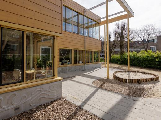“Alleen het houten geraamte van het gebouw is blijven staan, samen met de betonnen fundering. Hieromheen is een nieuw gebouw gezet,” zegt Rik Piters, adviseur huisvesting van onderwijsorganisatie Spaarnesant. Het gebouw is nu volledig gasloos én energieneutraal. Het bevat twaalf leslokalen en een kinderdagverblijf.