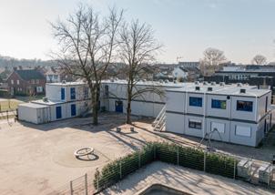 van 2022 eerst de eenlaags bebouwing te renoveren, vervielen er tijdelijk vier groepsruimtes. Dit is tijdelijk opgevangen binnen de resterende acht groepsruimtes en een naastliggend bouwdeel dat later geheel gesloopt zou worden. Na gereedkomen van fase één in december 2022 waren er acht nieuwe groepsruimtes beschikbaar en is de school hierin verhuisd. Zo konden de acht resterende groepsruimtes gerenoveerd worden. In de zomer van 2023 kon de school ook deze acht groepsruimtes weer betrekken. Vanaf dat moment waren er zestien groepsruimtes beschikbaar. Het kinderdagverblijf nam intrek in vier van de lokalen op de begane grond en het laatste bouwdeel kon definitief gesloopt worden, waarna de totale oplevering en bijkomende verhuizing plaatsvond in de zomer van 2023.”