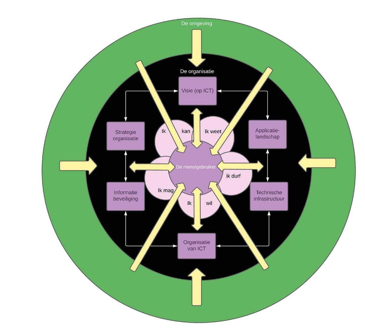 Een volgende aanvulling is de strategie van de organisatie. Stel: je wilt als organisatie het onderwijs flexibiliseren, een vraagstuk dat bij veel mbo-instellingen leeft. Dan zijn er veel meer aspecten waarop je als organisatie moet inspelen dan alleen ICT. Denk aan de veranderende rol
