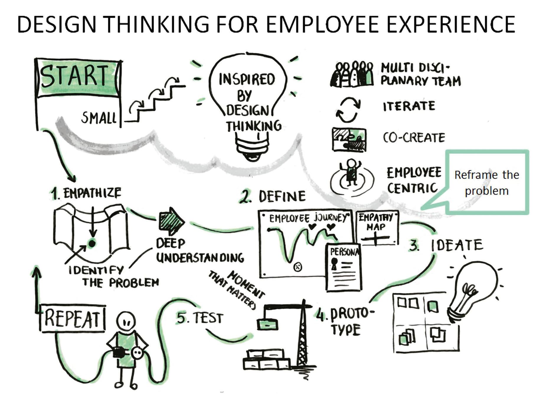 Gebaseerd op de 5 stappen van Design Thinking kunnen we de medewerkerbeleving bewust en doelgericht verbeteren: