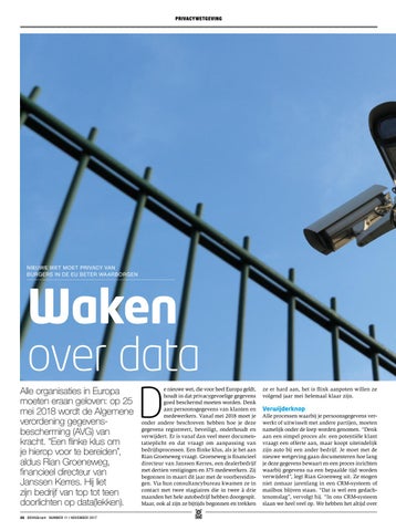 Waken over data Alle organisaties in Europa moeten eraan geloven: op 25 mei 2018 wordt de Algemene verordening gegevens bescherming (AVG) van kracht. “Een flinke klus om je hierop voor te bereiden”, aldus Rian Groeneweg, financieel directeur van Janssen Kerres. Hij liet zijn bedrijf van top tot teen doorlichten op data(lekken). 26 BOVAGkrant NUMMER 11 / NOVEMBER 2017