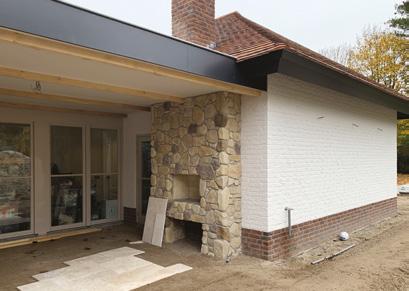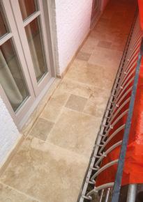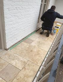 ook meegenomen zodat hij ook tegelen in Romaans verband kan leren. De bewoners van deze woning willen het hele achterterras met deze travertintegels in Romaans verband laten betegelen, maar voor we daaraan beginnen, moet de winter eerst voorbij zijn.” Om een idee te geven van het Romaans verband is onder een overkapping al een proefstuk neergelegd.