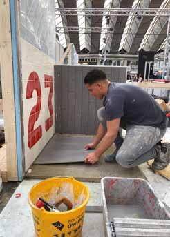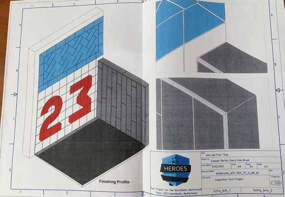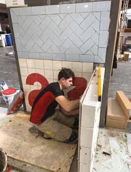 Maar ook het onderste deel van die wand vraagt zorgvuldigheid en nauwkeurig werken. In dat vlak moet het getal 23 in vloeiende overgangen gelijmd worden. Een opdracht die de meeste finalisten met goed gevolg en binnen de tijd hebben afgerond, zo is de tweede dag te zien. “Het voegen van deze wand moeten de finalisten vandaag ook nog doen. Een drukke dag dus waarop ze moeten laten zien dat ze hun werkzaamheden goed kunnen plannen.”