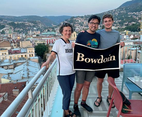 Chester Eng ’11 met Alan Casey ’24 in Sarajevo, Bosnia and Herzegovina, after Alan’s mother, Amila Masic-Casey (left), spotted Chester in a Bowdoin cap at a local café and introduced the two alums. They had quite a scenic backdrop for the occasion!