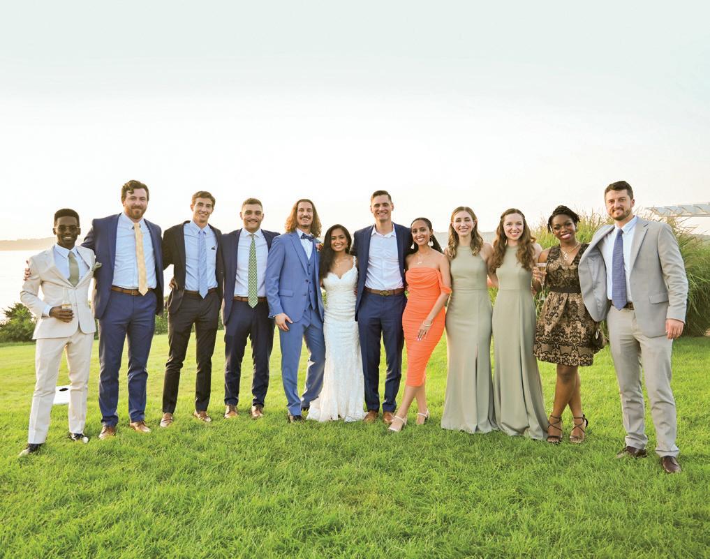 2. Jasmin Mahabamunuge ’15 and Pieter Martino ’17 were married on September 4, 2023, in Newport, Rhode Island. Pictured: Malik McKnight ’15, Colin Meehan ’17, Cyrus Nassikas ’17, Mike Paul ’17, Pieter and Jasmin, Jono Harrison ’19, Rebkah Tesfamariam ’18, Natalie Smid ’15, Jackie Maher ’15, Yaya Julien ’15, and Sam King ’14.