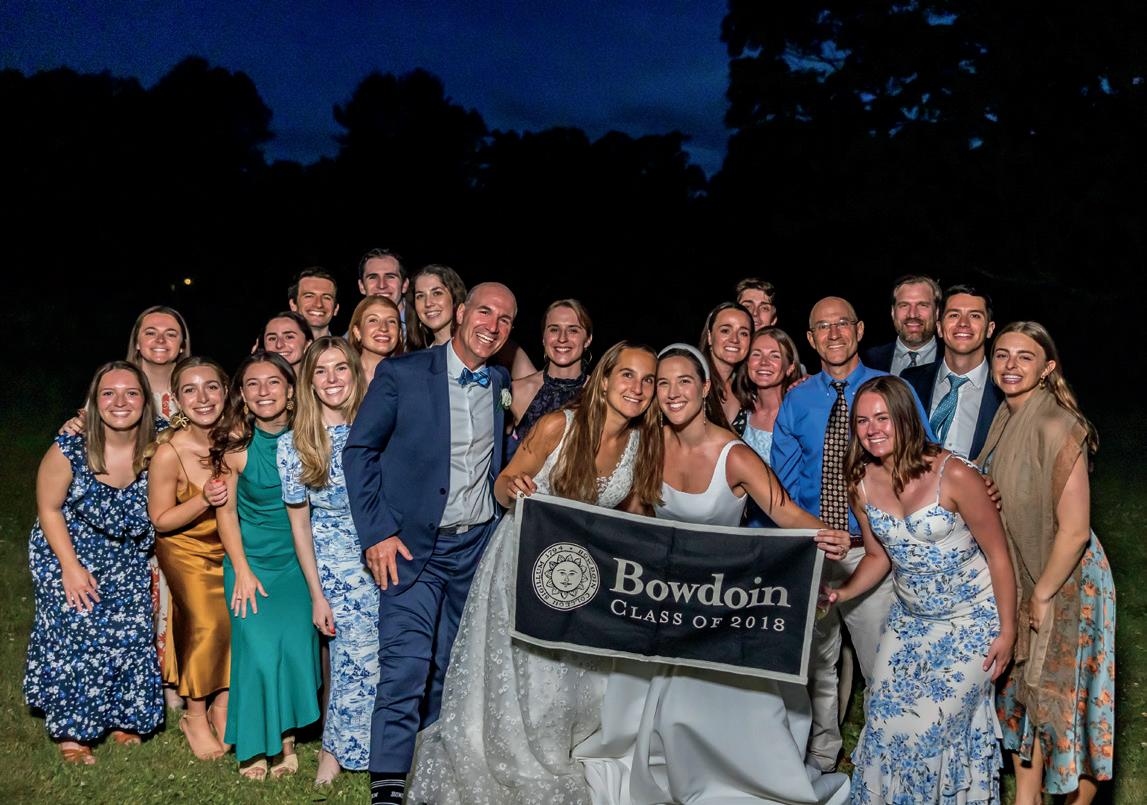 Pictured: Zach Duperry ’18, Osa Fasehun ’18, Elizabeth, Kara Lopez-Lengowski ’18, Nate Forlini ’18, Clayton Rose, Phoebe Thompson ’18, Ava Alexander ’18, Nickie Mitch ’18, and Noah Verzani ’18. Former Bowdoin president and uncle of the bride Clayton Rose officiated the ceremony.