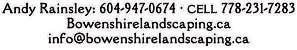 bowenislandundercurrent.com • A31Thursday, September 22, 2022 BOWEN HOME SERVICES love the life you live 604 987 7663 BOWENISLAND ROOFING ROOFING&REPAIRS Trade ticket certified #00012 RO 96 WWW WHITEHART CA ADDRESS 302-566 ARTISAN LANE BOWEN ISLAND BC PHONE 1 (778) 999-3434 BUILT GREEN BC BUILDER NEW CONSTRUCTION RENOVATIONS RESTORATION ADDITIONS SECONDARY STRUCTURES UNIQUE OUTDOOR SPACES SUB CONTRACT WORK CONTACT US FOR A FREE QUOTATION Window Blinds On Bowen 778-995-1902 Landscape Lighting Irrigation Seascape Bruce Culver Office: 604-947-9686 Cell: 604-329-3045 Tim Rhodes REALTOR® 604.341.9488 RHODES ON BOWEN REAL ESTATE MARKETING going that extra mile rhodesonbowen.com tim@rhodesonbowen.com RoB BOWEN ISLAND SPECIALISTS! QUALITY SERVICE GUARANTEED! Keep Calm and Call Econo 604.980.3333 991 West First Street, North Vancouver, BC www.economovingandstorage.com All candidates meeting Oct 2nd 3:30 6pm Bowen Island School Gym see you there! II I&I TOWING HAULING LTD Vehicles • Construction Equipment Sea-Can Containers • Tiny Homes Bowen Island • Greater Vancouver Vancouver Island • Sunshine Coast Michael Bingham • 604 947 1717 ianditowhaul@gmail.com PLEASE RECYCLE THIS NEWSPAPER.
