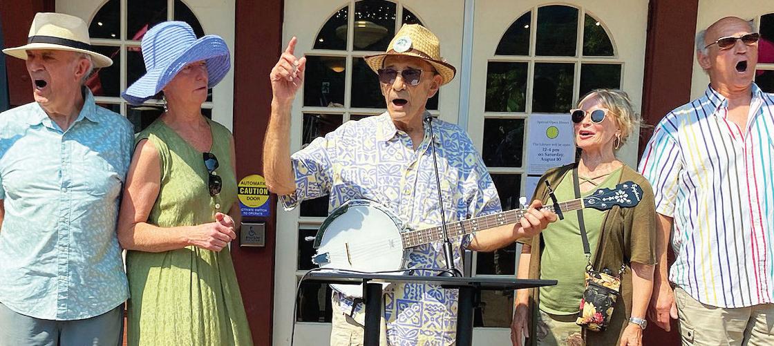 The100th birthdaycelebrations forthe Old General Store –and the current Librarybuilding –onSaturday, August 10 in Snug Cove included song.Here, Bowen mainstays (L-R) MartinClarke,Leah Cline,David Smith (on loan from Mexico), Susan Hogan and Graham Ritchie lead celebrants in asong about Bowen Island.The eventalso included bagpipes,agroup of lively jazz musicians,exhibits courtesy of the BowenIsland Museum and Archives,cupcakes, speeches and acommunityphoto. /Marcus Hondrophoto