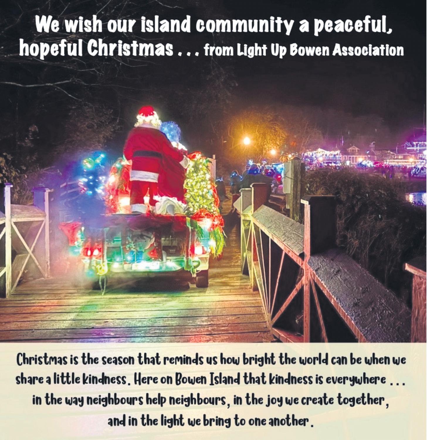 Majorkudos to everybodywho organized and took part in making theLight Up BowenFestival yetanotherone to remember. Thesnowfall addition wasthe cherry on topofthis holiday treat. Bigcredit to Santaand Mrs. Claus(photographed by ChrisWilson below) who alwaysstay till theveryend to make sure everybody hasachance to make their Christmas wishes heard!