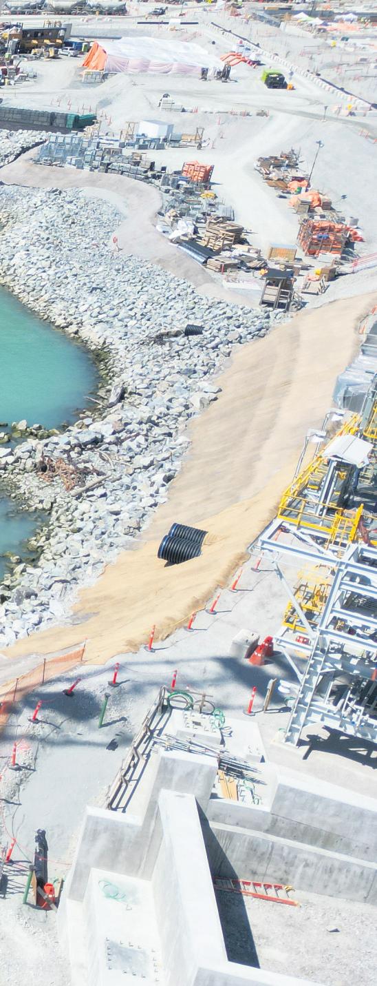 TheWoodfibreLNG siteistaking shape.Onland,crews are progressing on foundations afterplacing the pipe rack modules.Offshore, piling hasbegun forthe first permanent supports forthe floating storage tank —amajor step in marine construction.