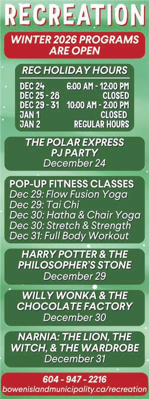 ‘Come All Ye’tothe BowenIsland Community Choir’s seasonal concerts at CatesHillChapelat2and 7:30 pm Tickets available at CatesPharmasaveoratthe door,$25 adults,$15 ages 11-17, 10 and underfree.