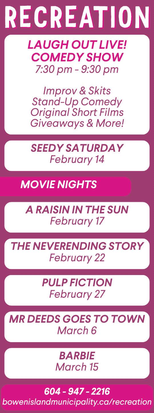 Sunday is also of course the Super Bowl! The Seattle Seahawks and New England Patriots face each other in the big game, which is being shown at many Bowen establishments if you are looking to watch the gridiron game with some company. After a long wait we’ve also cycled back into Olympics season with the Winter Games underway in Italy. It’s always fun to see the many different and creative snow sports on display, and it’s a competition where Canada is always in the discussion thanks to our northern nature. Italy sits nine hours ahead of us so the next two weeks will provide plenty of athletic action to get you up and at ‘em in the morning!