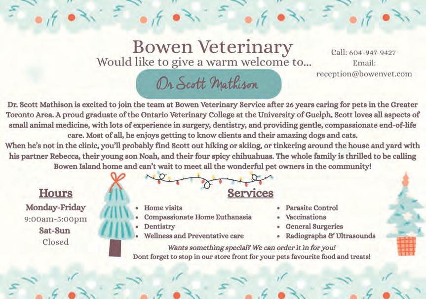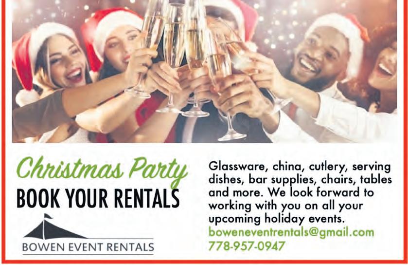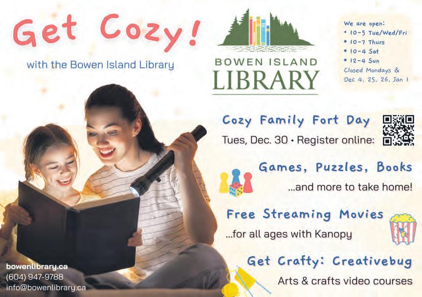 Come to the Friends of the Bowen Island L ibrary Society’s Holiday Book Sale in the B owen Library Annex! Drop by and shop t his selection of quality used fiction, c hildren’s books, and more! All funds r aised support the Bowen Island Library. 10 - 2 pm
