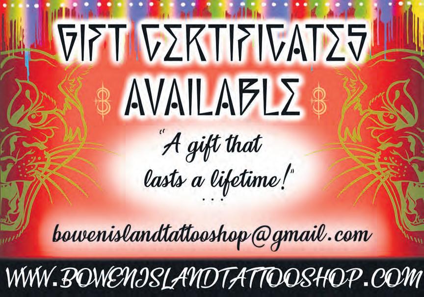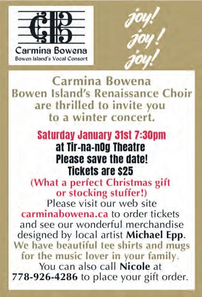 ‘Come All Ye’ to the Bowen Island C ommunity Choir’s seasonal concerts at C ates Hill Chapel at 2:00 pm and 7:30 pm . A dults $25 Seniors & Youth $15 (10 years & u nder free) Tickets Cates Pharmacy & at the door.