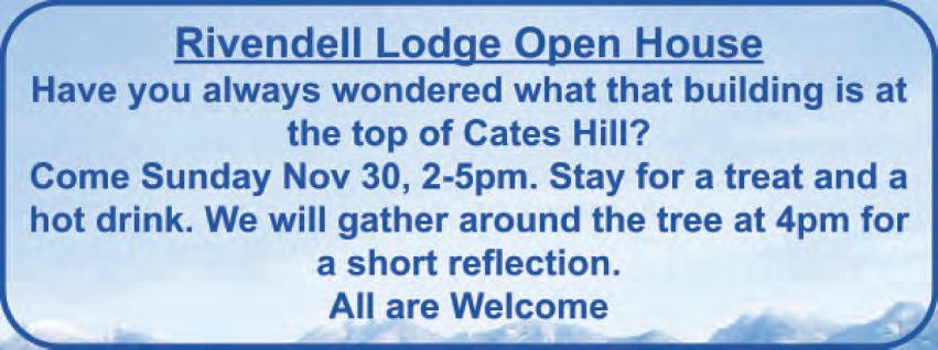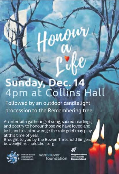 ‘ Honour a Life’ 4 pm at Collins Hall. An i nterfaith gathering of songs, sacred r eadings and poetry to honour those we’ve l oved and lost, and to acknowledge the r ole grief may play at this time of year. B rought to you by the Bowen Threshold Singers. bowen@thresholdchoir.org