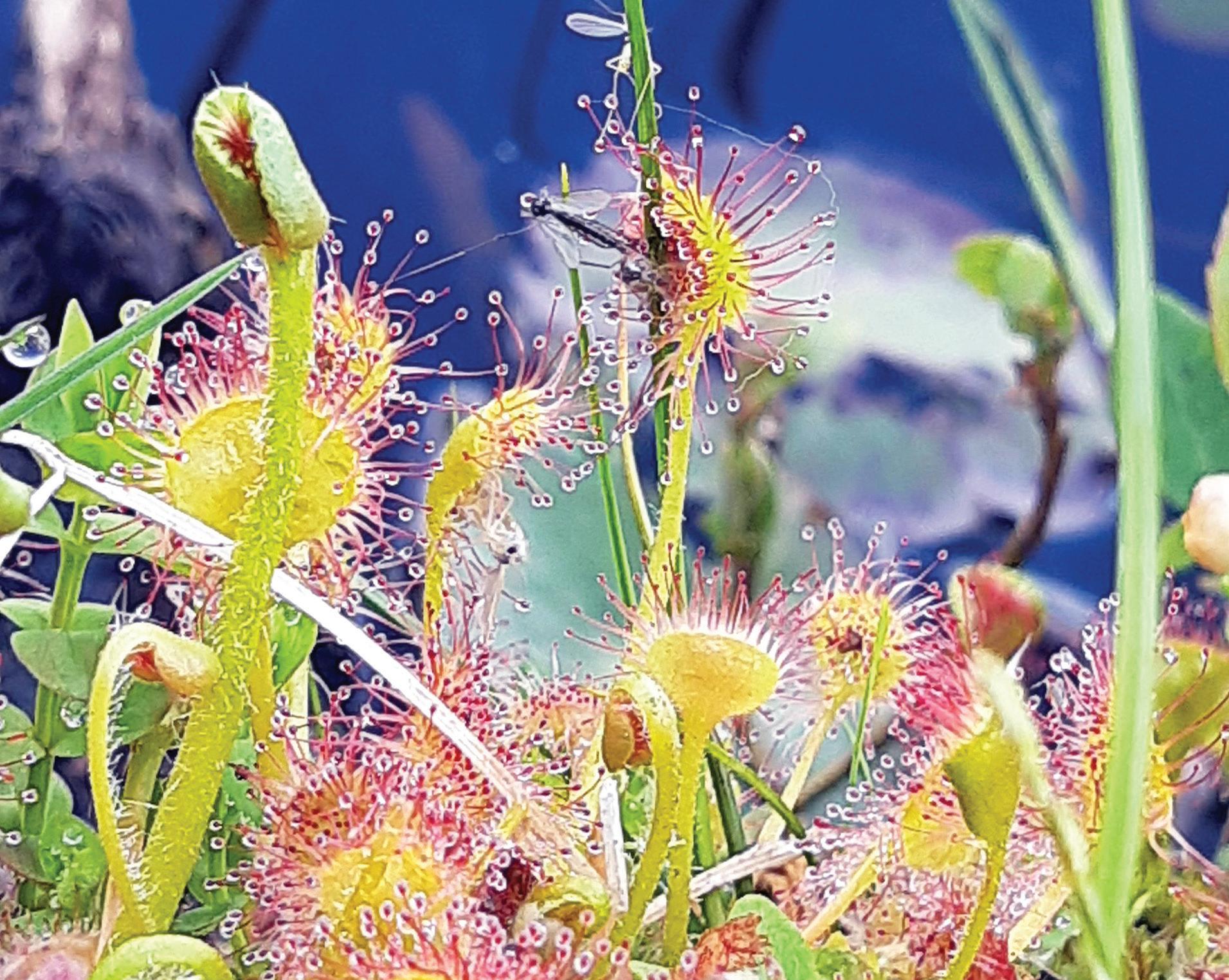 Each leaf has a slender stem that ends in a round blade about as wide as your thumbnail. Across the leaf’s upper surface are short red hairs, each tipped with a tiny sugary drop of sticky fluid that sparkles in sunlight. A sweet smell entices insects to land to have a tasty snack, only to discover themselves ensnared in a sticky death trap.