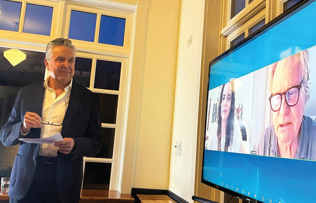 Charles McNeill (left) spoke to the Rotary Club last week about opportunities for collaboration between Islanders and Indigenous residents of the Amazon Rainforest in Brazil. Alice Fortes & Wade Davis (on-screen) were fellow speakers at the community talk at Artisan Eats. / Steven Trende photo