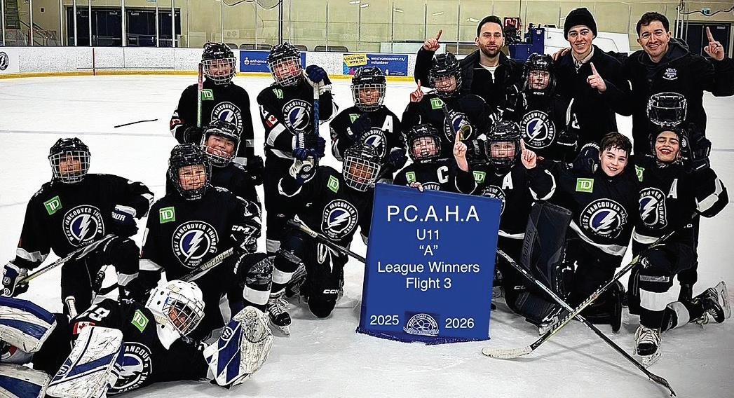 West Vancouver Thunder U11 A1 team won their Pacific Coast Amateur Hockey Association flight in the championship game on March 10. Early mornings and many ferry trips paid off for Islanders Lochlan Stevenson and Eli Montgomery when their team won the title in a balanced and well-played game against North Vancouver 5-2. Pictured are Bowen Island supporters David & Vivian Pearce, Robert & Linda Barratt and the Stevenson family and friends who came out to support. / Sheana Stevenson submission